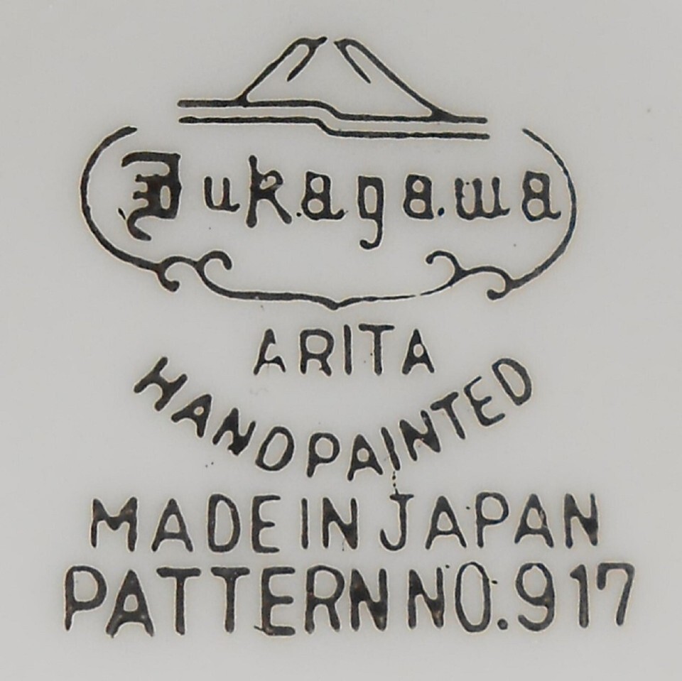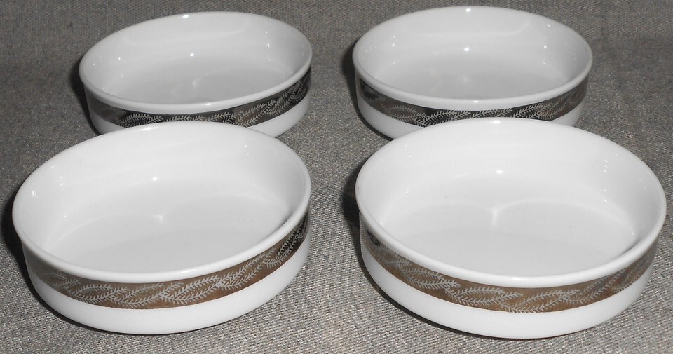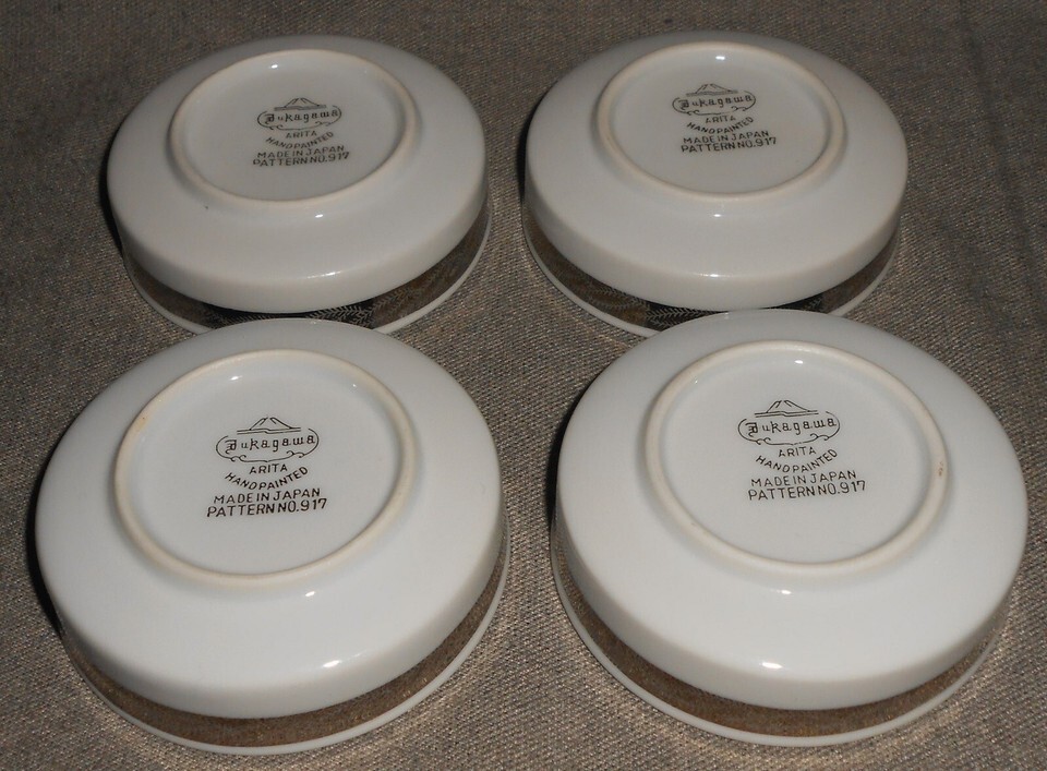 This is a Set of (4) 3" Porcelain Coasters from Fukagawa Arita in the Mid Century 1950s-60s Silver Lichen #917 Pattern and Made in Japan. The platinum trim is vibrant with no wear and the coasters are in good pre-owned condition with no chips or damage.***PLEASE NOTE: The discoloration and bright spots on the platinum trim or surfaces are from the camera/lighting. All of the color and platinum trim are in perfect condition with no discoloration or wear***