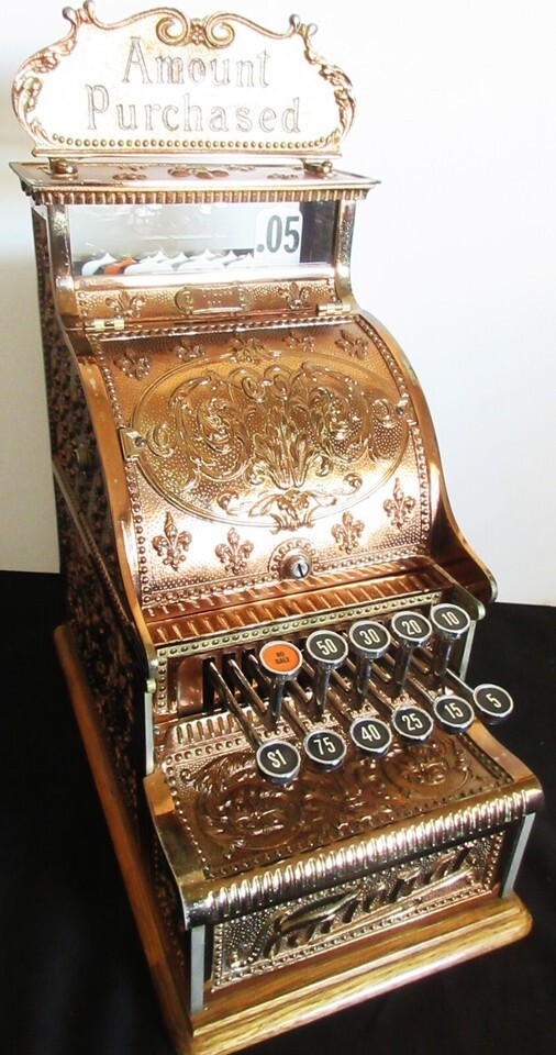 A fully restored National Cash Register (NCR) Model #211 brass finish detail- adder register serial #672399.