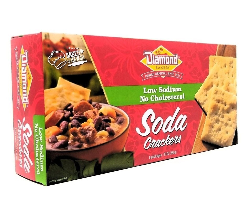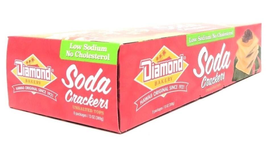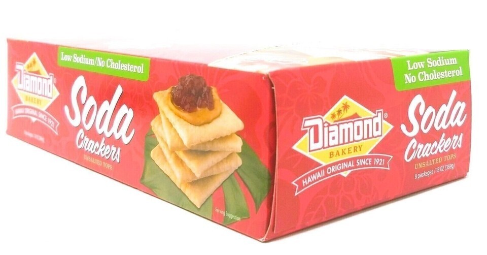 Enjoy the simple, classic taste of Hawaii with Diamond Bakery Unsalted Tops Soda Crackers. Baked in Honolulu since 1921, these crisp, golden crackers are made without added salt on top?perfect for those looking for a low sodium, no cholesterol snack. Light, crunchy, and versatile, they pair perfectly with soups, spreads, cheeses, or enjoyed straight from the box.