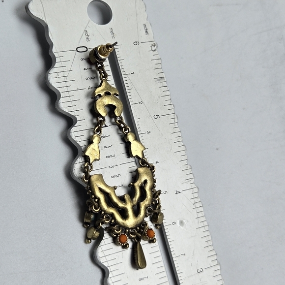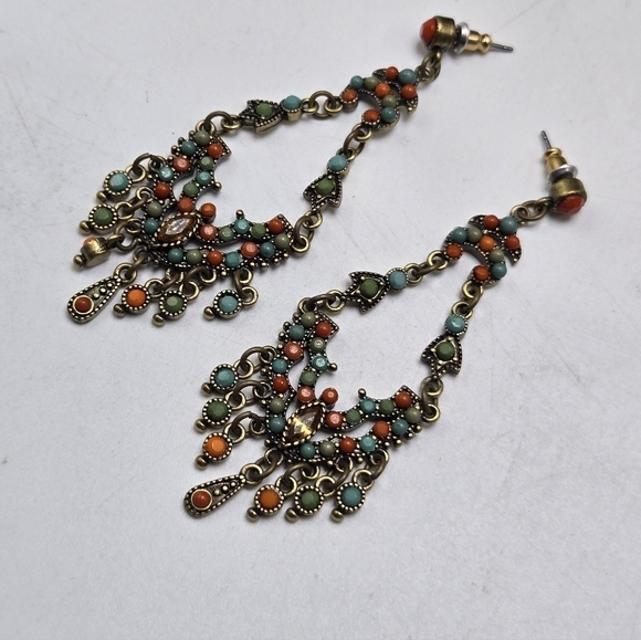 Vintage Estate 00's Faux Turquoise Orange Dangle Drop Earrings Pierced Brass Tone Statement Fashion Costume Jewelry Collectable
