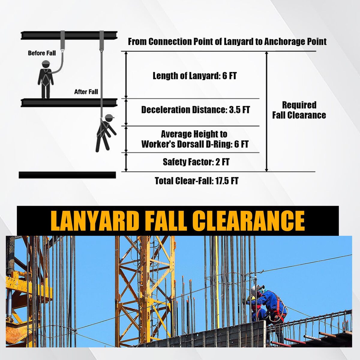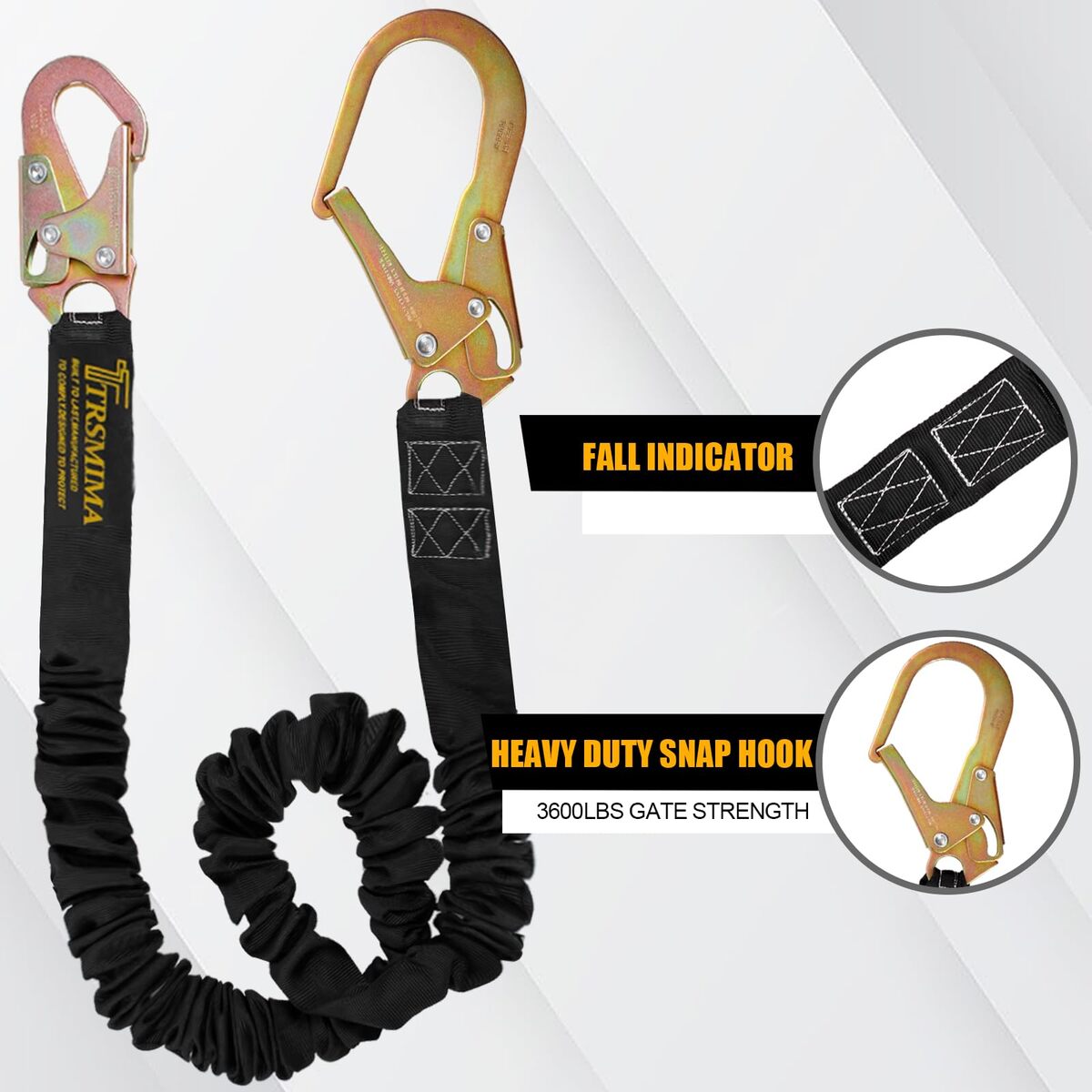 SAFE: The fall protection lanyard is designed with safety in mind.Safety lanyard has a lightweight yet heavy-duty outer polyester webbing that is strong and durable that made of 100% polyester Heavy Duty construction materials provides maximum security. It also has a specially sewn polyester core that reduces impact forces. Additionally, it features two heavy-duty that provide secure fastening.,DOUBLE LOCKING GATES: Regar Snap Hooks used on Internal Shock Absorbing Lanyard marked are forging steel material,self-locking with minimal tensile break strength of 5,000 lb. and a 3,600 lb.gate rating. Should be connected to the dorsal D-ring of the fall protection harness as a part of a personal fall arrest system.,DURABLE: The stall smart safety tool lanyard is built to last. The tough webbing used in its construction is highly resistant to abrasion and aging.It doesn't soften easily from frequent use.The webbing also has low shrink properties and can withstand high temperatures.,CONVENIENT: This chainsaw lanyard combines two functions into one, making it convenient to use. It serves as both a fall arrest lanyard and a shock absorber. This eliminates the need for an additional bulky shock pack, reducing the risk of tripping hazards. Its elasticated leg can expand from 4-1/2 to 6 feet with a maximum capacity up to 310 lb (141 kg) including clothing, tools, etc., The lanyard has a tensile strength of 8,500 lbs, ensuring reliable performance safety lanyard.,CERTIFICATED: The tactical lanyard meets all the strict requirements set by the American National Standards Institute (ANSI) and is in compliance with various safety regulations, including those of the Occupational Safety and Health Administration (OSHA). It specifically meets the standards of ANSI Z359. Applied to Construction, Climbing, Roofing, Camping, Window cleaning.