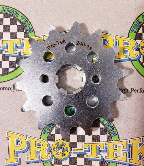 Pro-tek front sprockets are also completely CNC machined to exact tolerances from 4140 nickel-chromoly steel resulting in a quality product. None of the Pro-tek front sprockets are gear hobbed, but are lightened with drilled holes to save on rotating mass. Every lb of rotating mass equates to a 4 lb weight reduction. The sprockets are then case hardened to Rc 58-60 and finished with a zinc plating for added durability and protection from corrosion. Made in the USA, normally retail for $29.95. This is for a 520 Pitch front sprocket 13 or 14 tooth.