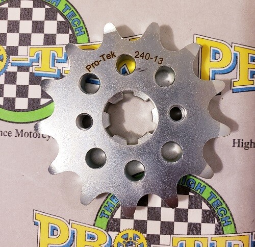 Pro-tek front sprockets are also completely CNC machined to exact tolerances from 4140 nickel-chromoly steel resulting in a quality product. None of the Pro-tek front sprockets are gear hobbed, but are lightened with drilled holes to save on rotating mass. Every lb of rotating mass equates to a 4 lb weight reduction. The sprockets are then case hardened to Rc 58-60 and finished with a zinc plating for added durability and protection from corrosion. Made in the USA, normally retail for $29.95. This is for a 520 Pitch front sprocket 13 or 14 tooth.