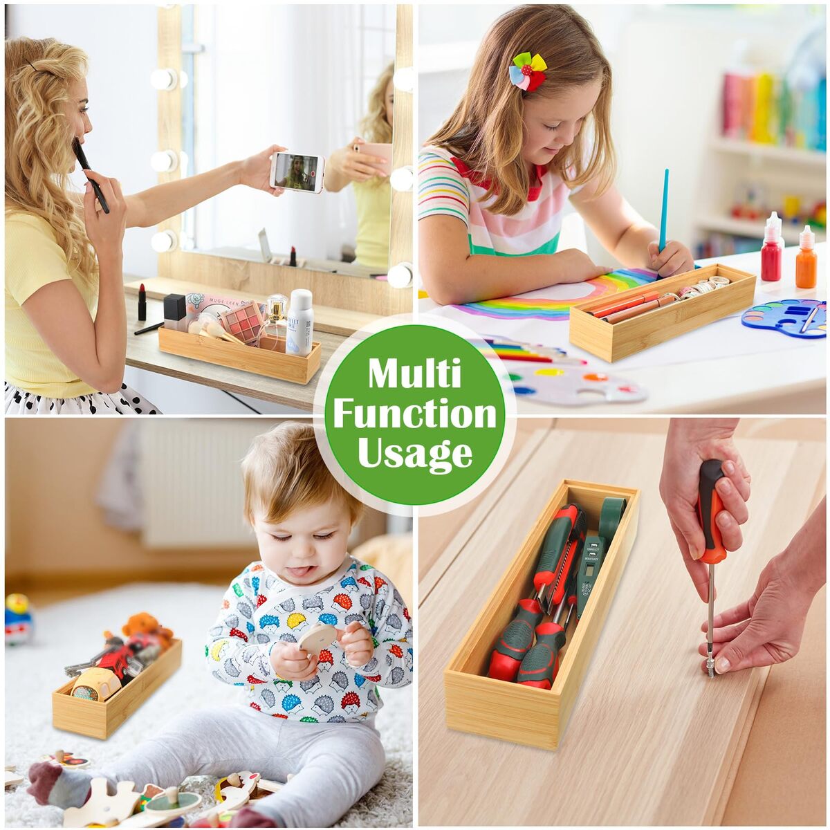 Features: Exquisite and compact size design of bamboo cutlery organizer will bring you much convenience in daily life, to give you a tidy home, kitchen, room, office and so on. You can also share the slim silverware organizer with your friends, family members, relatives, colleagues, roommates, neighbors and others as practical gifts. Specifications: Material: bambooColor: as picture showsSize: about 12 x 3 x 2 inchesPackage includes: 8 x Bamboo drawer organizerNotes: Manual measurement, please allow slight errors on size. The color may exist a slight difference due to different screen displays.