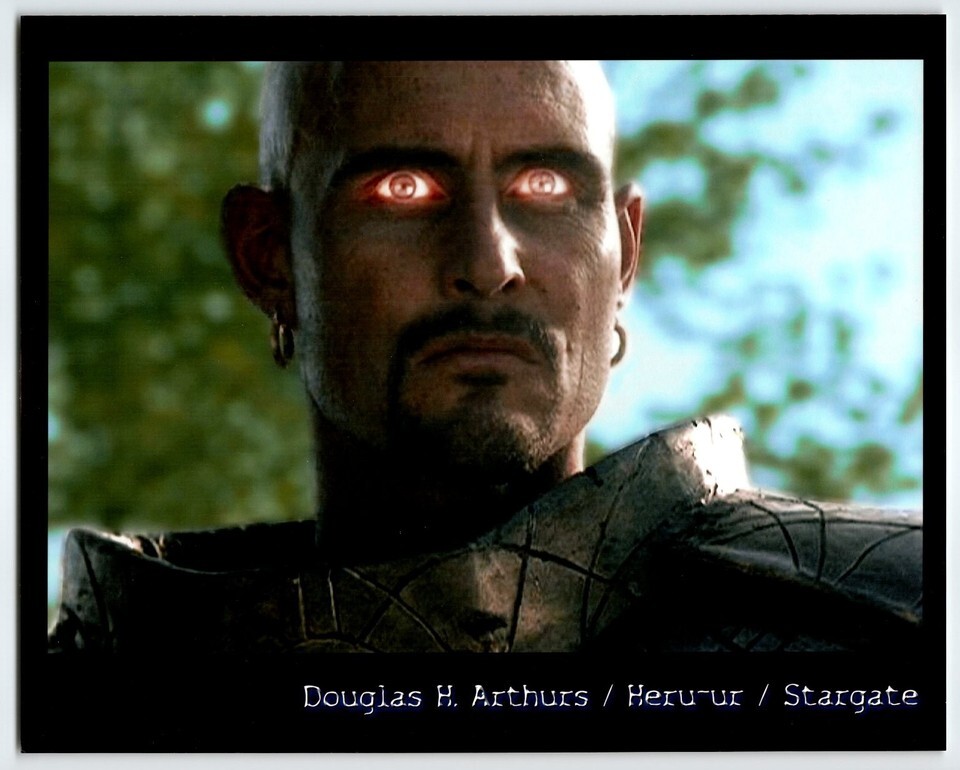 This vintage 8x10 press photo features Douglas H. Arthurs as the character Herur from the popular sci-fi series Stargate. Capturing the intense and memorable look of Herur with glowing eyes and detailed armor, this image offers a striking glimpse into the show's imaginative alien world. The photo's sharp focus and authentic costume design highlight the production quality that made Stargate a cult favorite.