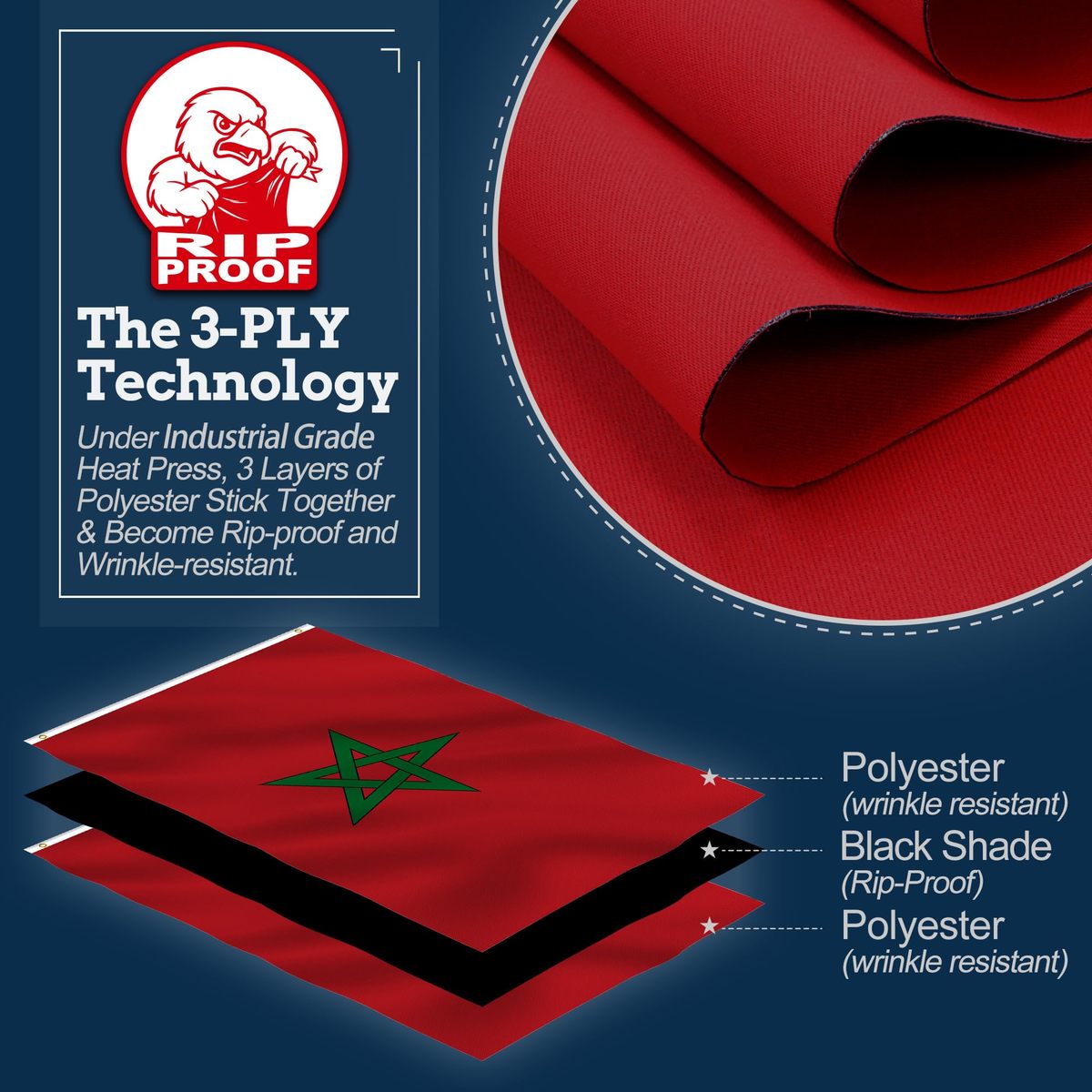 The Rip-Proof Series - Constructed by heat pressing 2 layers of specially polyester that is resistant to tearing and ripping in the middle, our Rip-Proof flag is super thick, durable, and tough!,Wrinkles resistant - Just like the "wrinkle-free" shirts, the specially made polyester surface is soft and resistant to wrinkle. You will immediately notice how "Unbelievably Smooth" the flag is when it arrives, and able to fly it right out of the box!,100% Blackout - The Anley Rip-Proof technology flag weights 13.5 oz, featuring total blackout, no see-thru, and therefore the more vivid and bright color. You will fully appreciate the workmanship and quality of this flag when it arrives.,THE REAL DEAL - Made in China. Adorned stainless steel grommets that are stronger and more rust-resistant than traditional brass. Four rows of stitching are used to reinforce flag hems and corners to reduce shedding. Ideal for outdoor use in windy areas!,UNPRECEDENTED WARRANTY - We have happy to announce that all the ANLEY Rip-Proof flags now come with a ?1-Year No Questions Asked? Anley Warranty! Buy with Confidence!