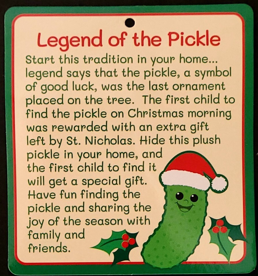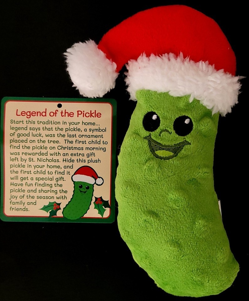 Start this tradition in your home? Legend says that the pickle, a symbol of good luck, was the last ornament placed on the tree. The first child to find the pickle on Christmas morning was rewarded with an extra gift. Hide this plush pickle in your home, and the first child to find it will get a special gift. Have fun finding the pickle and sharing the joy of the season with family and friends.'