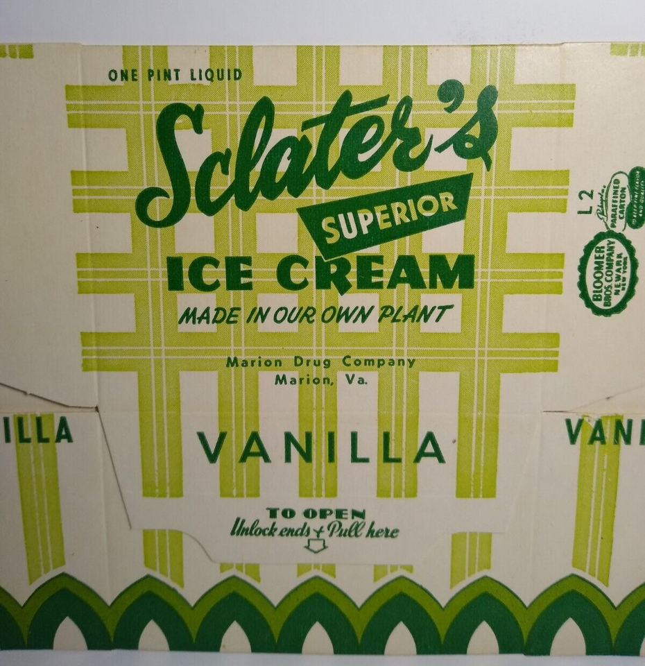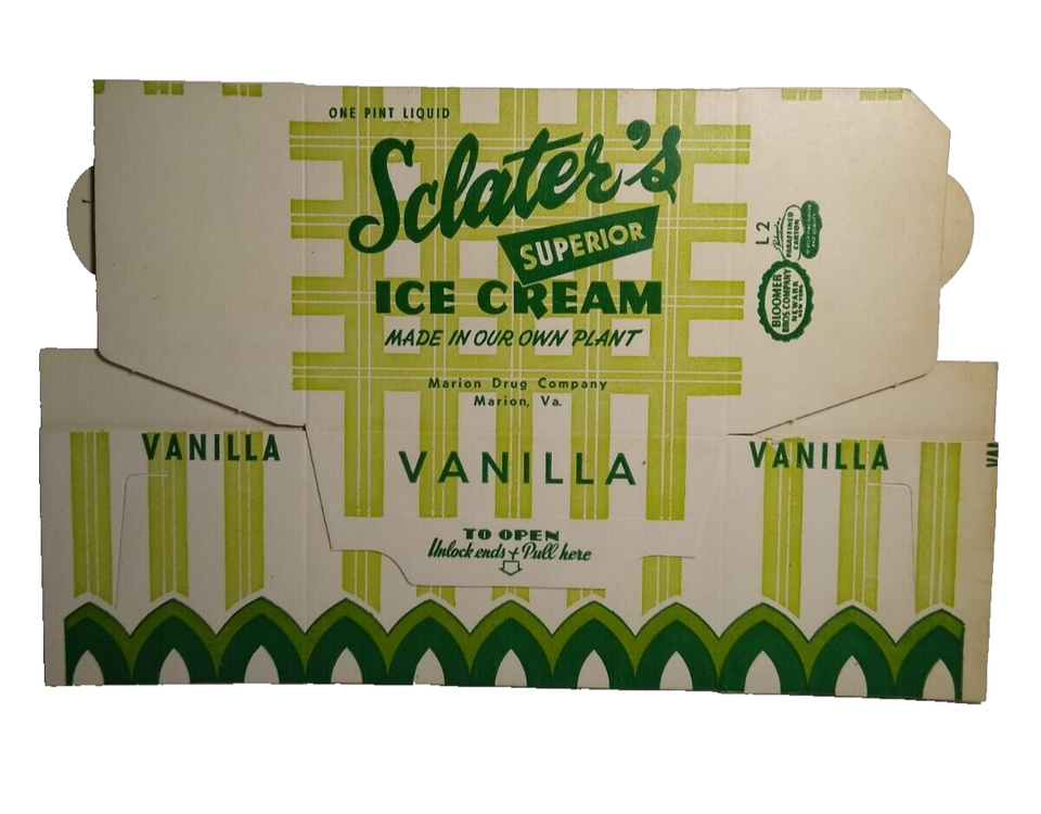 The product is a vintage NOS wax pint cardboard container advertising Sclater's Superior Vanilla Ice Cream from Marion, VA. It features a box type of advertising with a multi-color design, original production, and a dairy theme. This collectible item was manufactured in the United States.