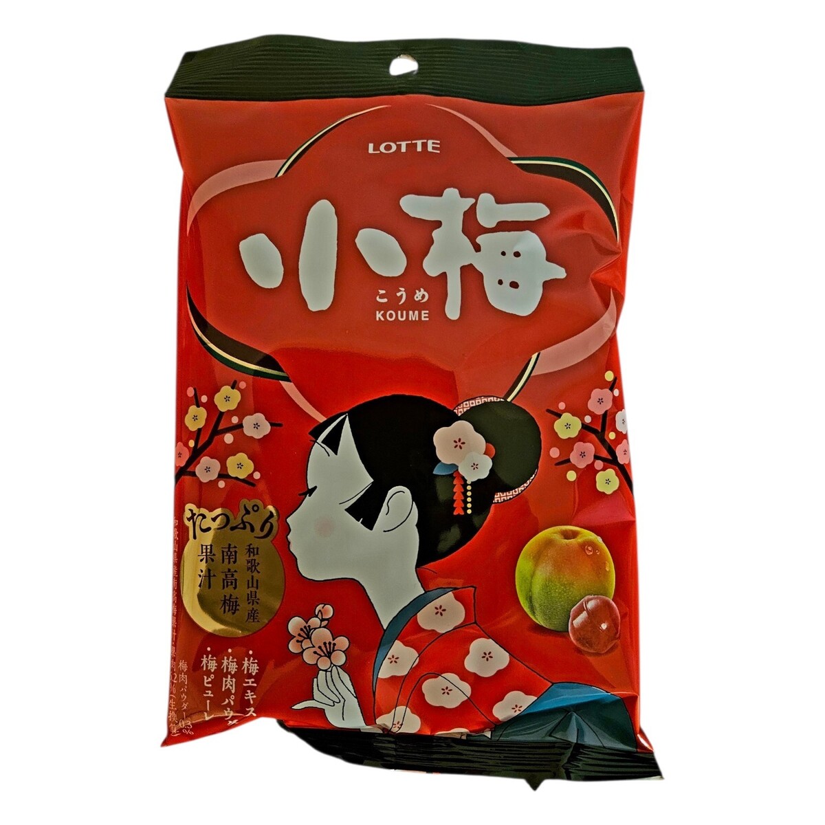 Lotte Koume-chan is a long-standing Japanese hard candy produced by Lotte, renowned for its signature sweet-and-sour plum (ume) flavor. Each bag contains a three-layered taste experience: a tart plum powder coating, a sweet plum-flavored candy shell, and a concentrated ume paste center.