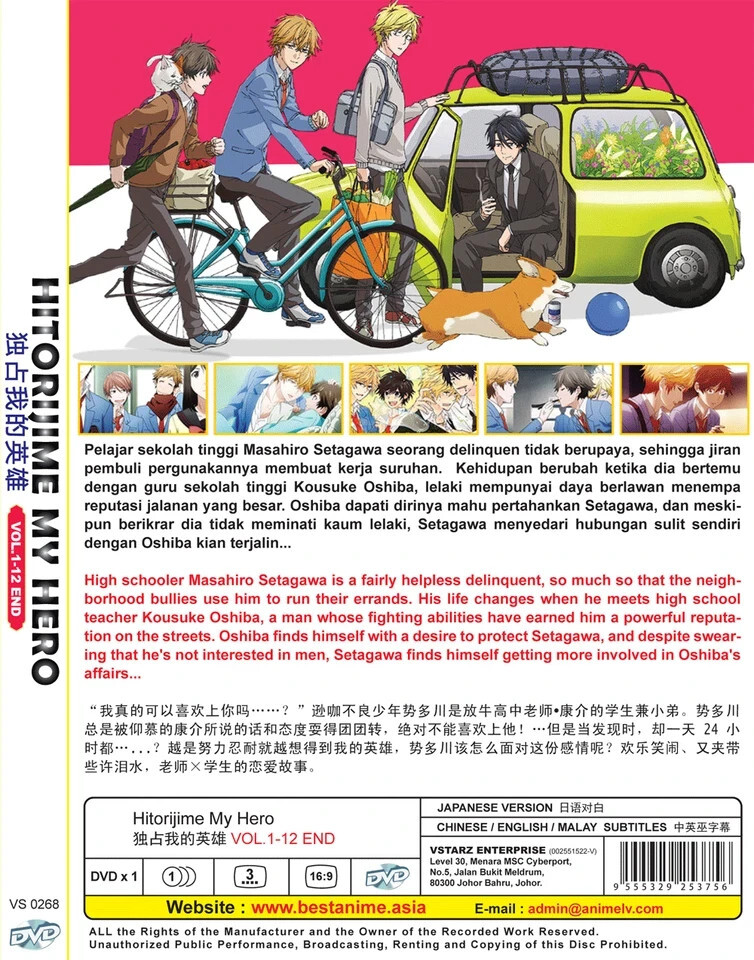 body { font-family: "Market Sans", Arial, sans-serif; } For detail of this set please view below only, and also to tell if this set has english or Japanese audio view below and check out the listing photo back side. If it shows as (Japanese / English Version means it has English audio but if it only shows Japanese Version no English Audio)All our set has at less English Subtitles if only Japanese audio. This set is all regions. HITORIJIME MY HERO VOL.1-12 END DVD Title Name HITORIJIME MY HERO VOL.1-12 END No of Disc 1 Disc (12 Episodes) Version Japanese Subtitles English/Chinese/Malay Format DVD / NTSC All Region Code (16:9) STORY : High schooler Masahiro Setagawa is a fairly helpless delinquent, so much so that the neighborhood bullies use him to run their errands. His life changes when he meets high school teacher Kousuke Oshiba, a man whose fighting abilities have earned him a powerful reputation on the streets. Oshiba finds himself with a desire to protect Setagawa, and despite swearing that he's not interested in men, Setagawa finds himself getting more involved in Oshiba's affairs... We Only Sell Original/Genuine DVDs. All DVDs I'm selling are from Licensed Publisher in Malaysia. All DVDs come with Original Sealed Authenticated Sticker / Hologram by Malaysia Censorship Board. ALL PACKAGE WILL BE SHIP OUT FROM USA CA SAN DIEGO AREA OCEANSIDE, SAN MARCOS. THIS MEAN WITH IN USA YOU SHOULD RECEIVE THE PACKAGE WITH IN 4-6 BUSINESS DAY AFTER SHIP OUT. We Only Sell Original/Genuine DVDs. All DVDs I'm selling are from Licensed Publisher in Malaysia. All our products are All region so it will play any dvd player in the world Any problem please contact us first so we can speed up taking care of you.