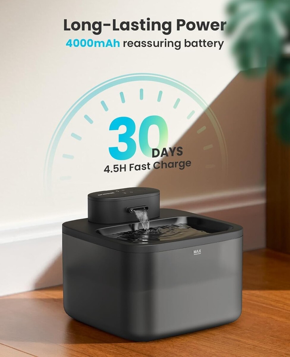The powerful 4000mAh rechargeable battery lasts up to 30 days, so you can keep your pet hydrated even during trips or power outages.