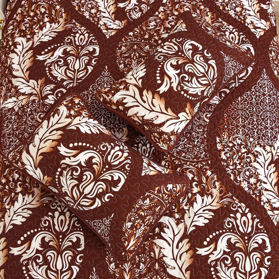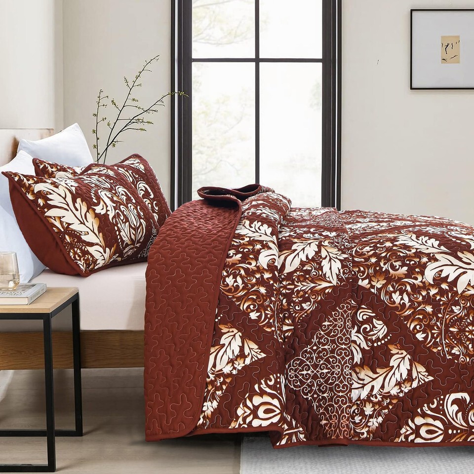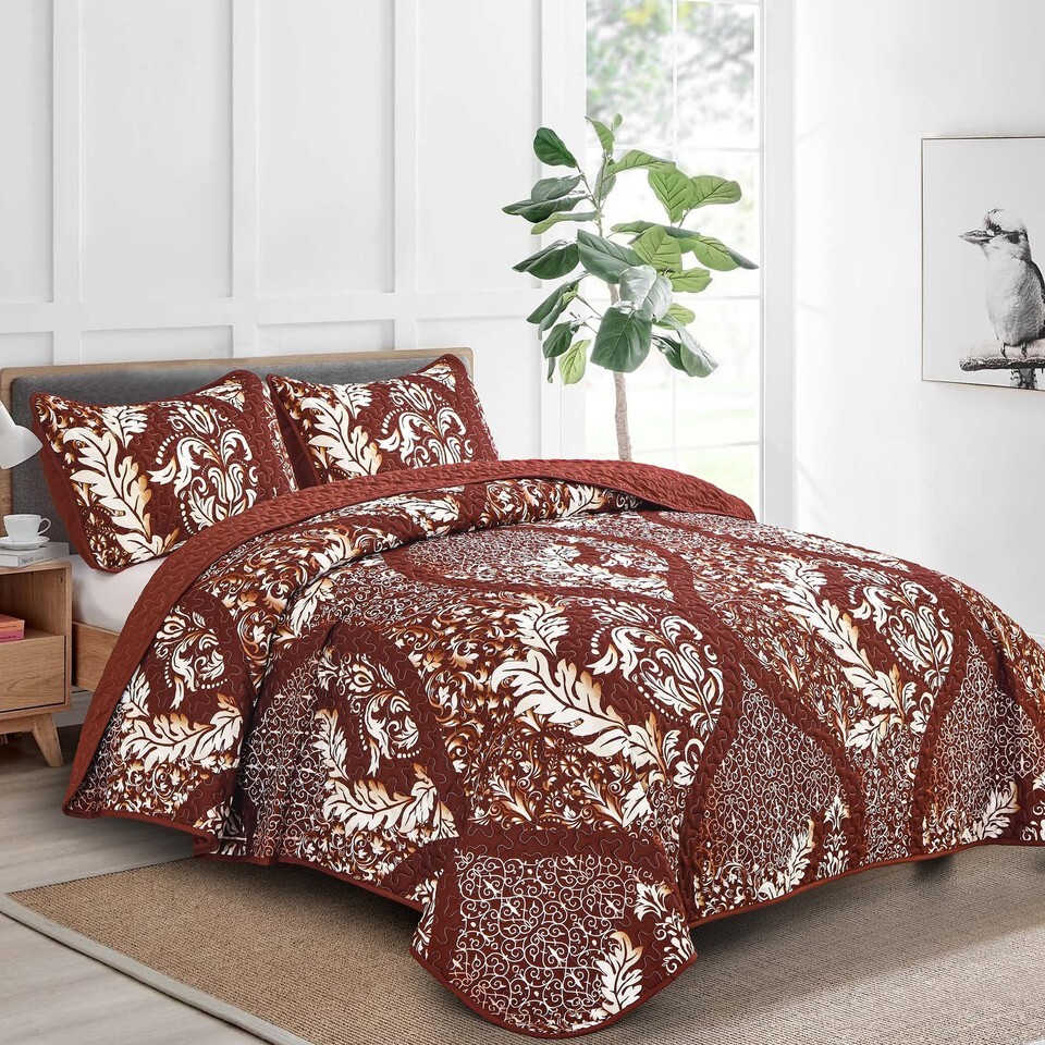 DJY King Burgundy Red Gold Damask Quilt Set Boho Bedspread Coverlet Soft