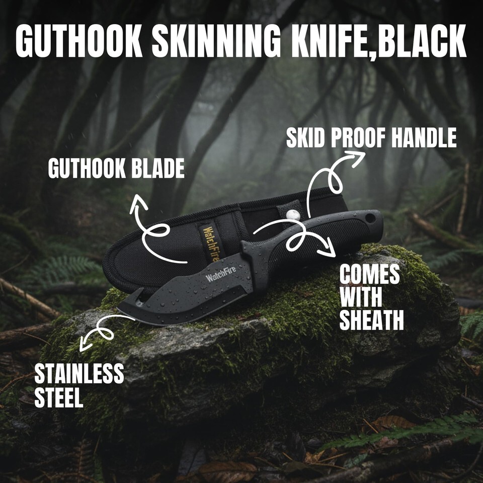 The WatchFire Guthook Skinning Knife is 9" in overall length. The stainless steel blade has a black finish. It has a skid proof black handle. It has a guthook blade . This knife comes with a sheath.