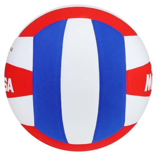 Competitive class volleyball, synthetic leather cover, red/white/blue, designed for indoor or outdoor recreational use. Official size and weight