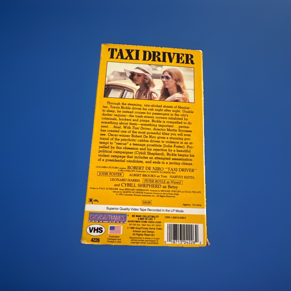 The product is a VHS tape of the 1976 film "Taxi Driver", directed by Martin Scorsese and starring Robert De Niro. The movie is considered a cult classic in the drama genre, known for its psychological and urban themes. It is rated R and features a leading role by Jodie Foster. The VHS tape is in English language with NTSC signal standard, presented in full screen edition by GoodTimes Home Video. This collectible edition offers viewers the chance to experience the iconic film in the format of VHS tapes, capturing the essence of the movie's cult status and lasting appeal.