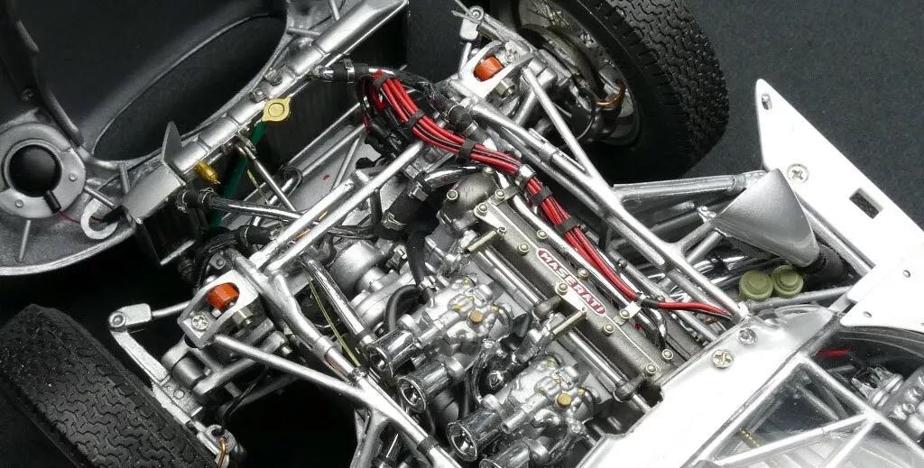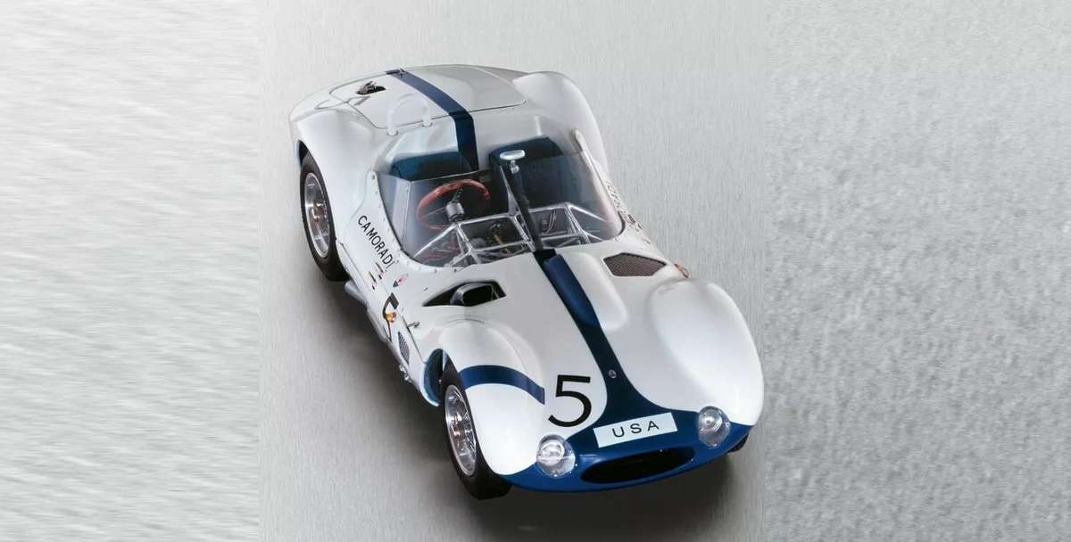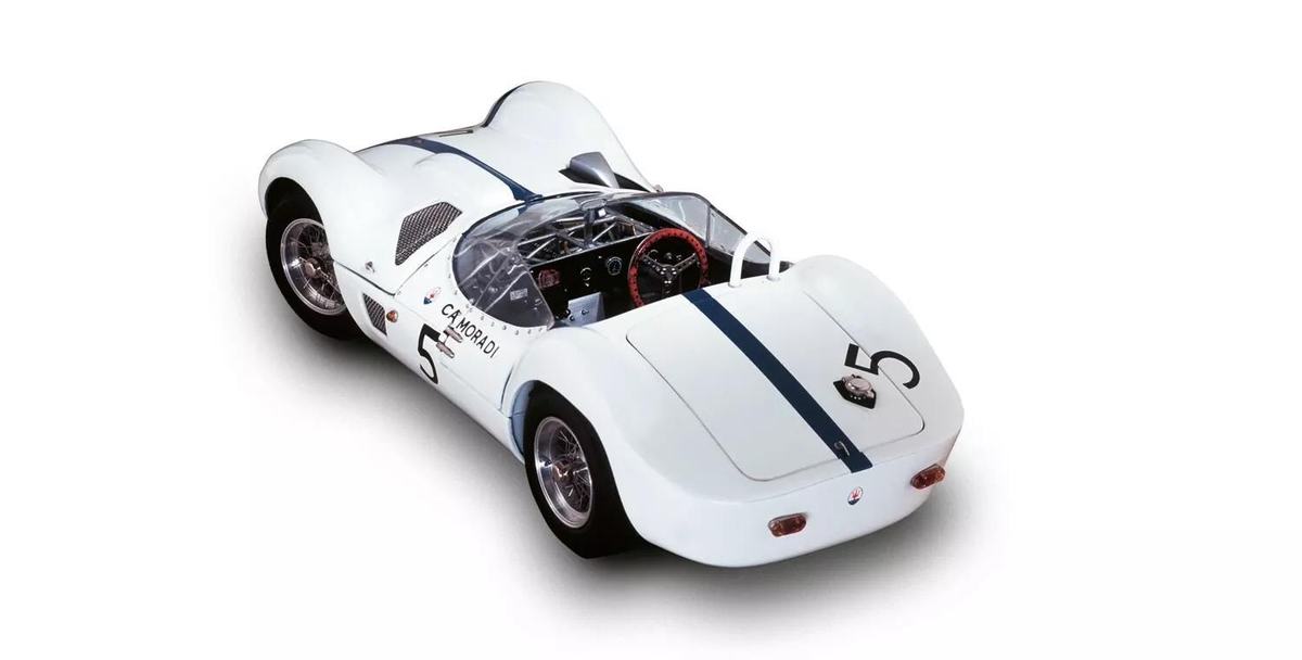 The complex space-frame, built from more than 200 single pieces of tube, gave the Maserati Tipo 60/61 his legendary nickname Birdcage. Behind this innovative engineering was Giulio Alfiere, the master-mind that promoted the idea of producing a space-frame of barely 30 kg. Indeed, the designing of the Birdcage space-frame represents a real stroke of genius. Wrapped up in a tight aluminium body, the Tipo 61 is powered by a 2.9-liter, four-cylinder in-line-engine which generates 250 hp on the road. Only 23 units of the Tipo 60/61 were made from 1959 through 1961. The white model painted with blue lengthwise stripes, is based on the championship car of Lucky Casners Camoradi-Team. It exemplifies the art of high-end model car manufacturing. Not only is the space-frame clearly visible in the area of the windshield, but many other details are also faithfully replicated to provide a feast for the eyes. Explore the fastest cage of all times!