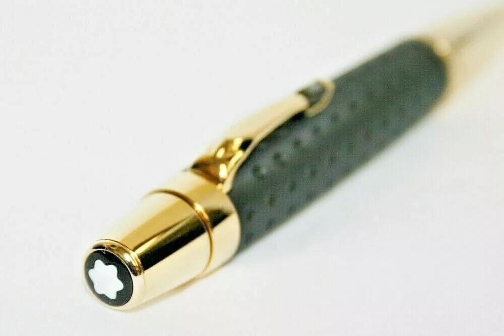 -Gold-plated forepart and cone inlaid with Montblanc emblem, three gold-plated rings and clip set with a synthetic paramount-cut onyx-coloured gemstone.