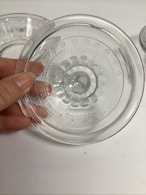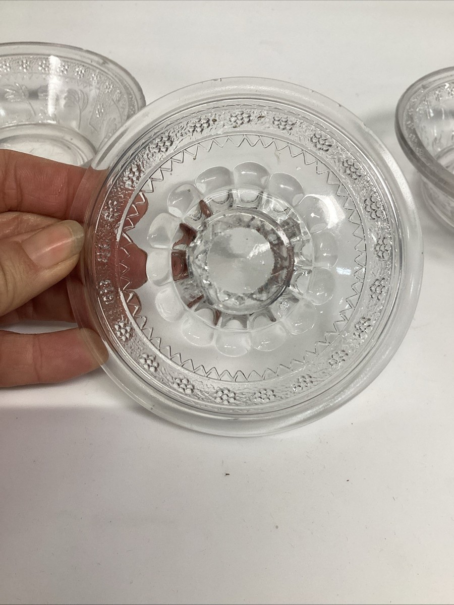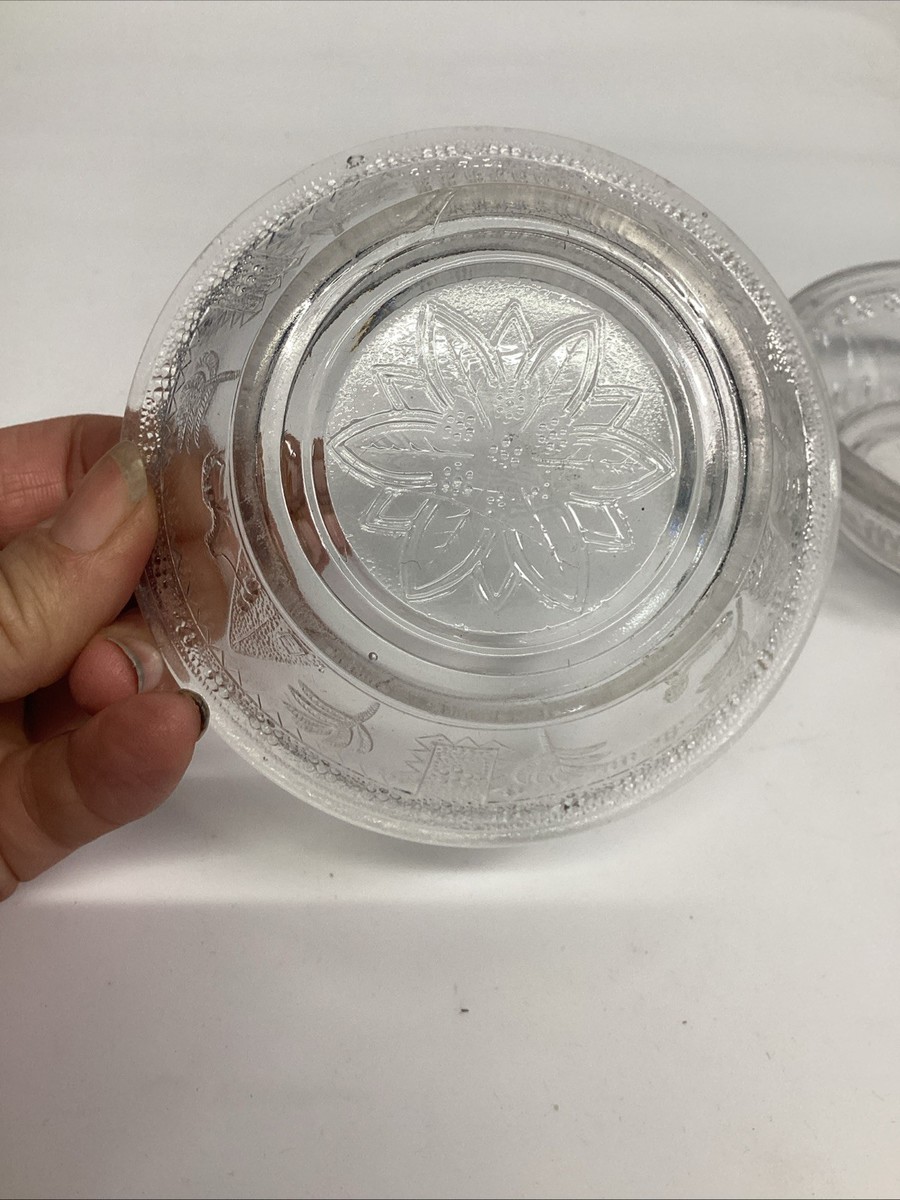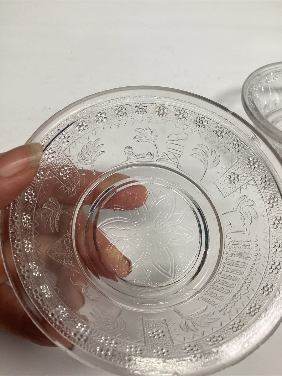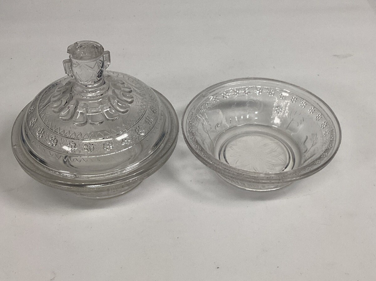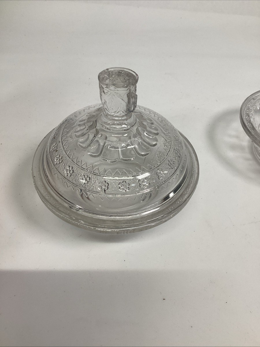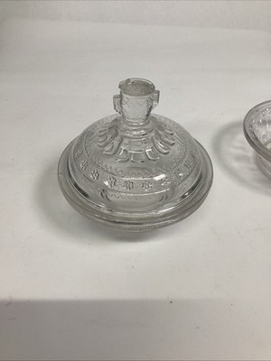 2 Antique EAPG Adam?s Co Egyptian Oasis Pattern Sphinx Candy Dishes (1 Lidded). These are in used condition and fair condition. One of these has 3 chips around the top edging. The other dish has 4 chips on the edges along with rough top edge. The lid has about 7 chips along the inner edge. The lid also has a couple chips on the tip where you hold it to pull up.