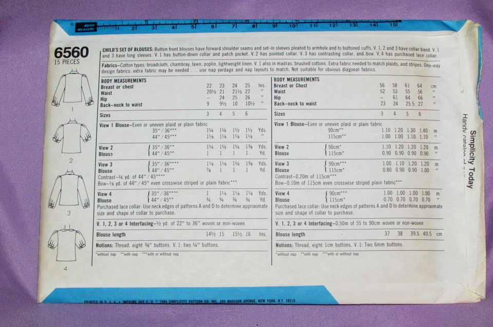 SIMPLICITY 6560 girl's size 5 set of 4 blouses long/short sleeves (sew drwr)