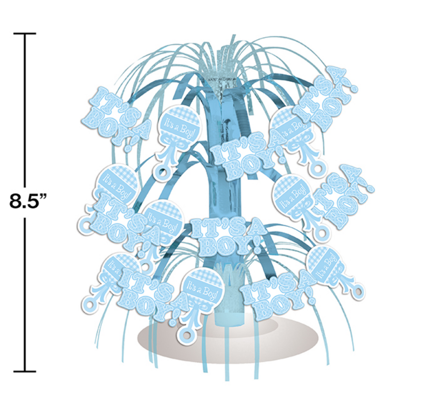 Our Baby Boy Blue Gingham Cascade Centerpiece features light blue foil streamers and festive cutout attachments of rattles and the phrase "It's A Boy". This adorable baby themed table decorations will add color and stylish fun to your table decor.