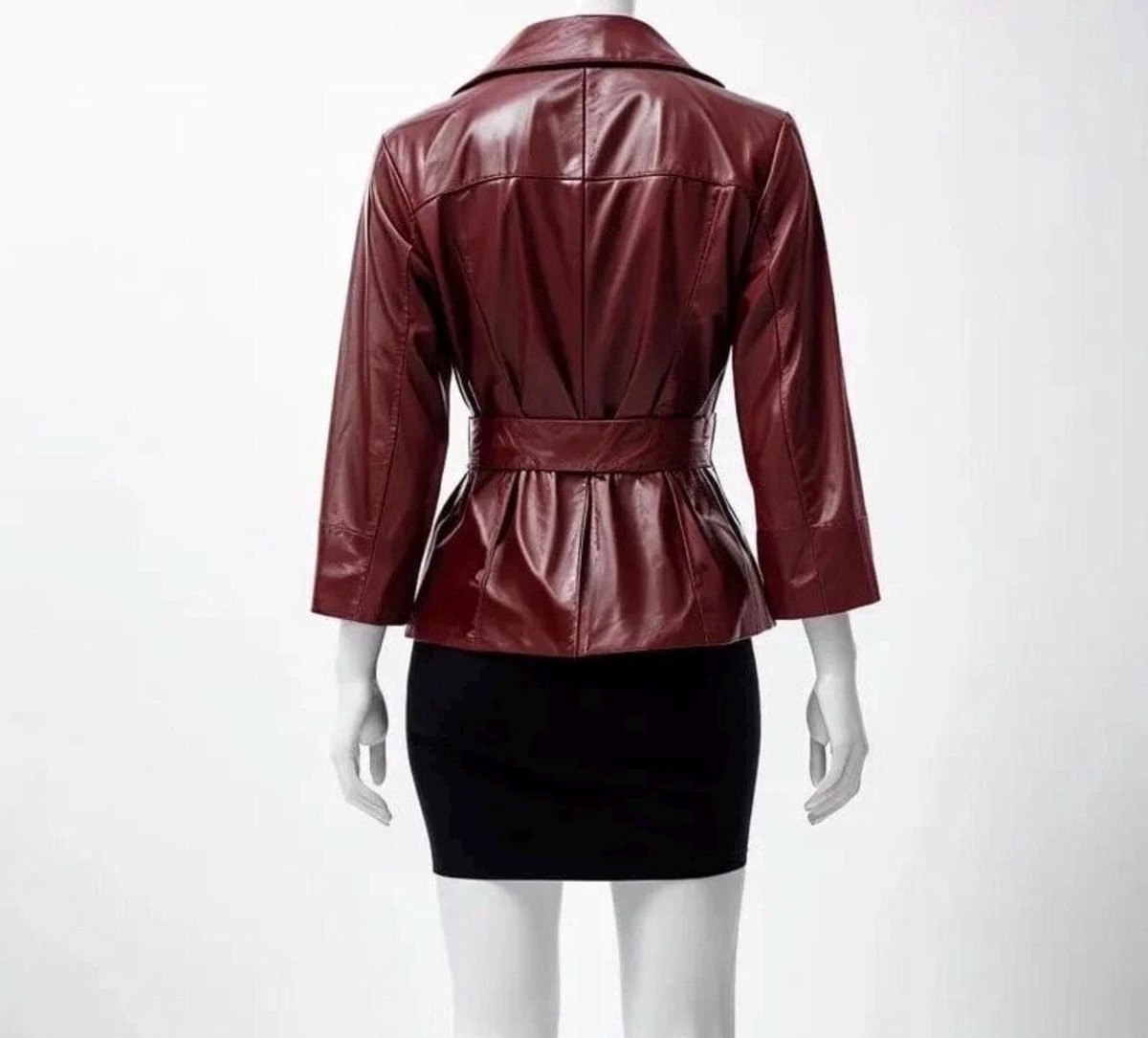 Turn heads with this womens burgundy leather jacket, inspired by bold, cinematic fashion. Designed with a sleek belted waist and structured lapel collar, this jacket offers a flattering fit while delivering a confident, edgy look. The rich maroon tone adds a luxurious feel, making it perfect for both casual wear and statement outfits.