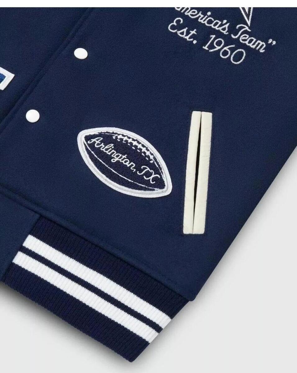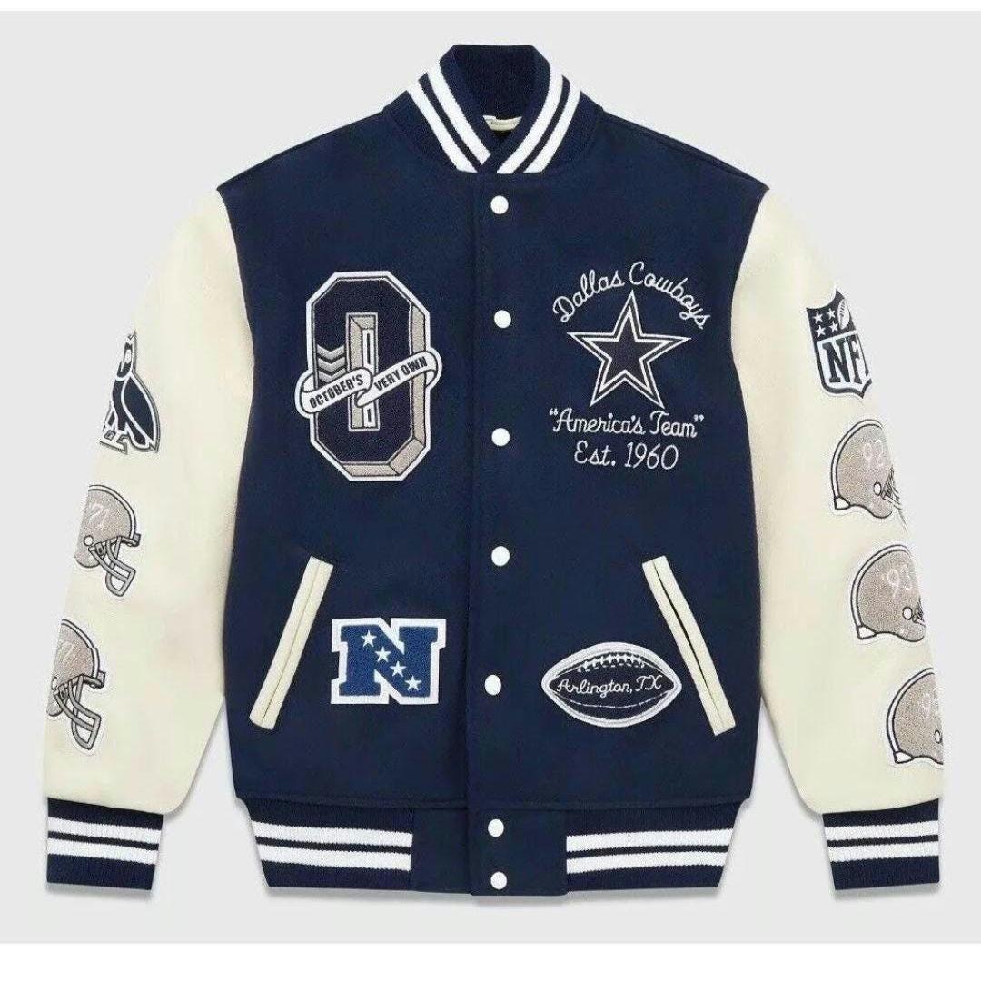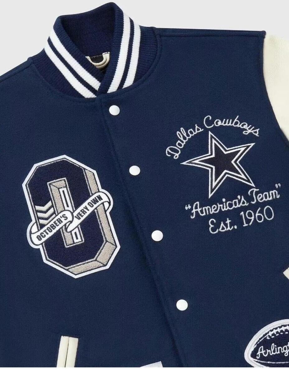 Elevate your style with this epic Letterman Varsity Jacket, a must-have for any fashion-forward man. This jacket is a collaboration between OVO and the NFL, featuring the iconic Dallas Cowboys logo on the front. The blue wool body and white leather accents create a bold contrast that will make you stand out from the crowd. This jacket is perfect for men of all sizes, with a regular fit that is comfortable and stylish. Whether you're heading to a game or just want to show off your love for the Cowboys, this Letterman Varsity Jacket is the perfect choice.