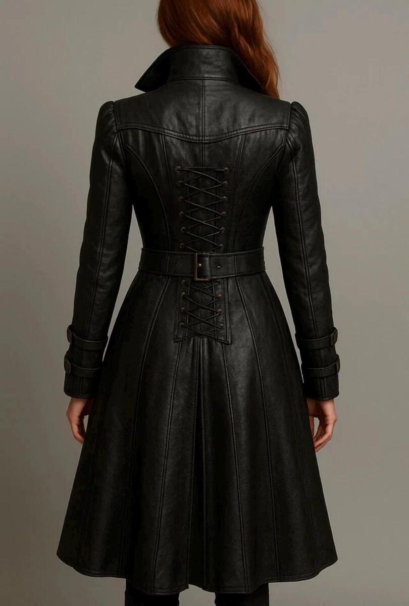 Make a powerful statement with this masterfully tailored Womens Black Leather Trench Coat. Fusing the structured silhouette of a Military Greatcoat with the delicate allure of Victorian Steampunk design, this jacket is the ultimate centerpiece for any alternative wardrobe.