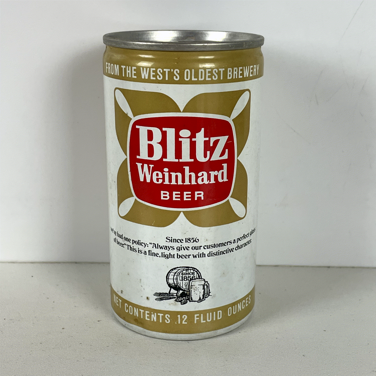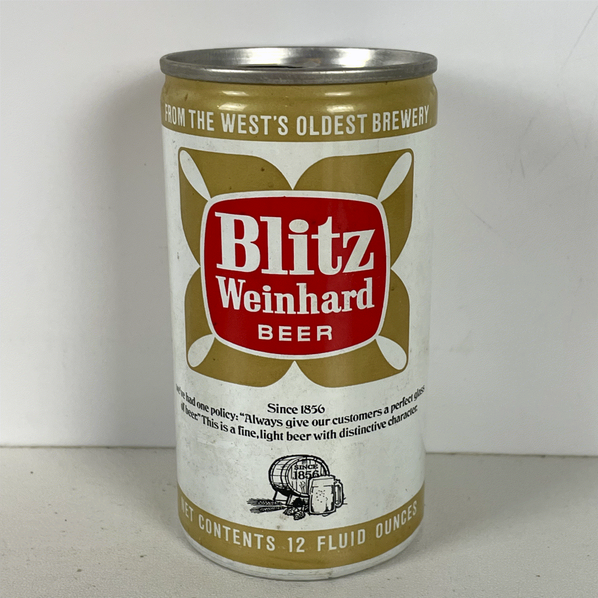 Discover a piece of brewing history with this vintage Blitz Weinhard beer can. This distinctive collectible features a classic white background adorned with striking gold and red accents. The iconic Blitz Weinhard logo is prominently displayed within a unique four-lobed red design, complemented by elegant gold leaf-like patterns. Text proudly declares "FROM THE WEST'S OLDEST BREWERY" and highlights the brand's heritage with "Since 1856" alongside a charming illustration of a beer barrel and mug. This 12 fluid ounce aluminum can showcases a timeless design, making it a prized addition for any beer can collector or enthusiast of vintage advertising memorabilia.