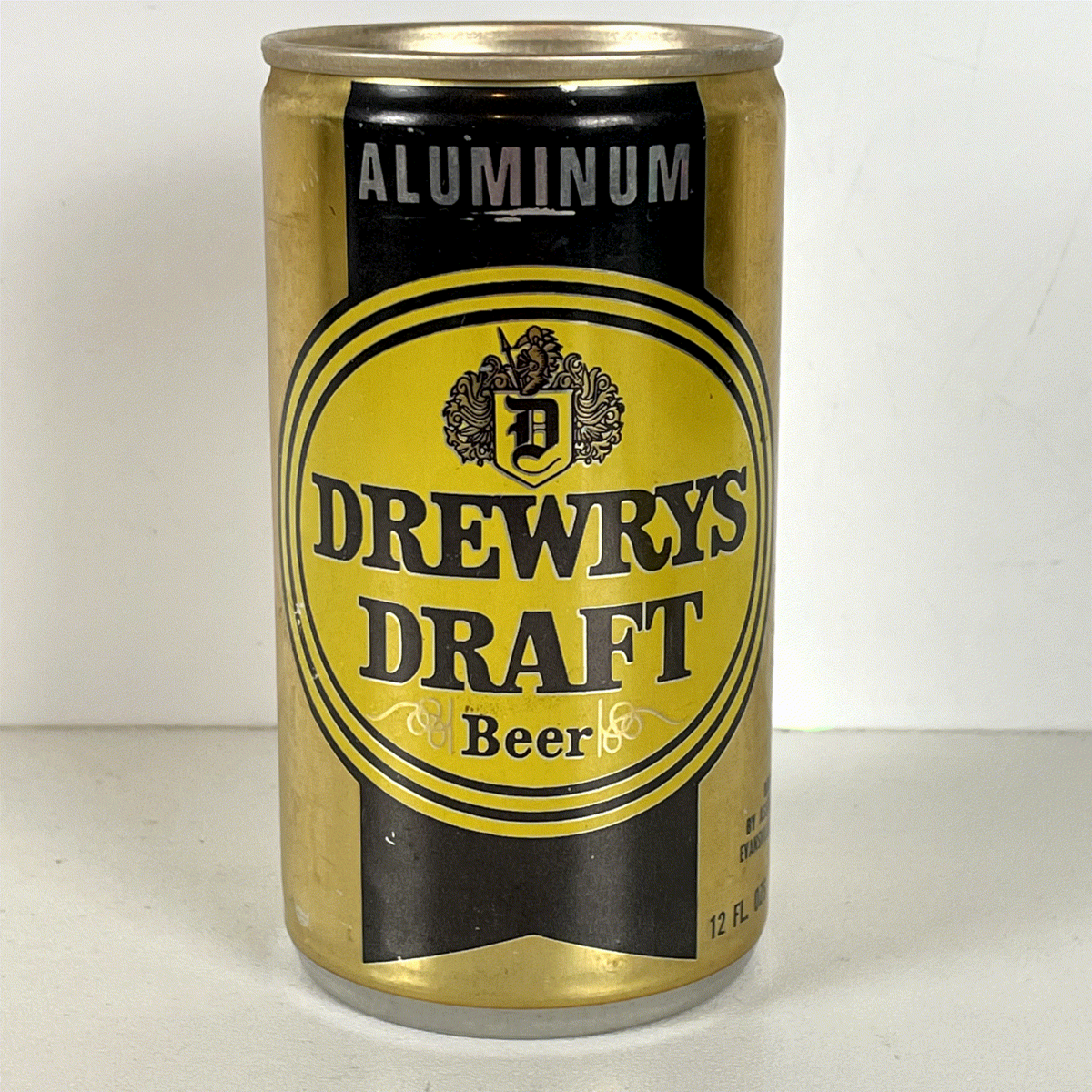 Discover this classic vintage Drewrys Draft Beer Can, a remarkable piece of brewing history. This 12 fl. oz. all-aluminum mini-keg features a distinctive gold and black label design, prominently displaying the "Drewrys Draft Beer" logo within an elegant oval, complete with a detailed crest. The can proudly states its "ALUMINUM" construction and unique "ALL ALUMINUM MINI-KEG" designation, highlighting its advanced design for its era. A true collector's item, this can represents a bygone era of American brewing.