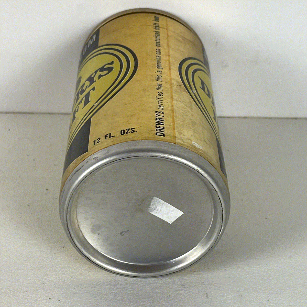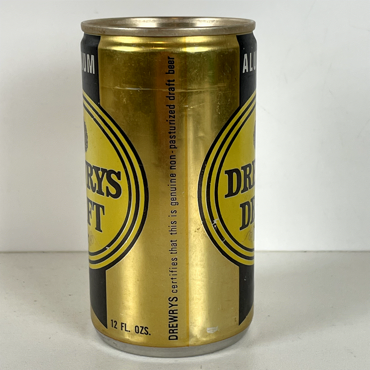 Adding to its vintage appeal, the can features a classic pull-tab top, a nostalgic detail for collectors. It also bears the inscription "DREWRYS certifies that this is genuine non-pasteurized draft beer," emphasizing the quality and style of beer it once contained. Brewed and filled by Associated Brewing Co. in multiple US locations, this can carries a rich heritage, making it a unique addition to any beer can collection, vintage advertising display, or breweriana enthusiast's treasure trove. Its striking design and historical significance make it a highly desirable collectible.