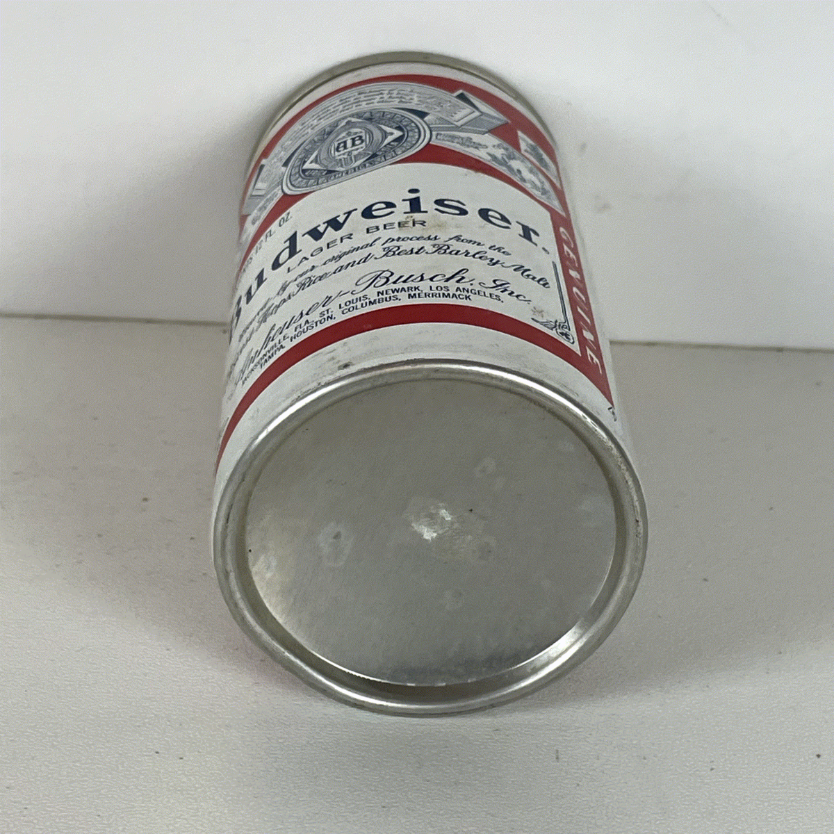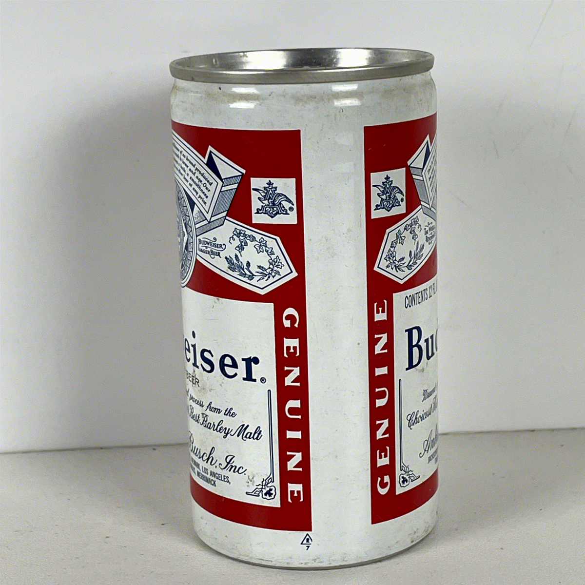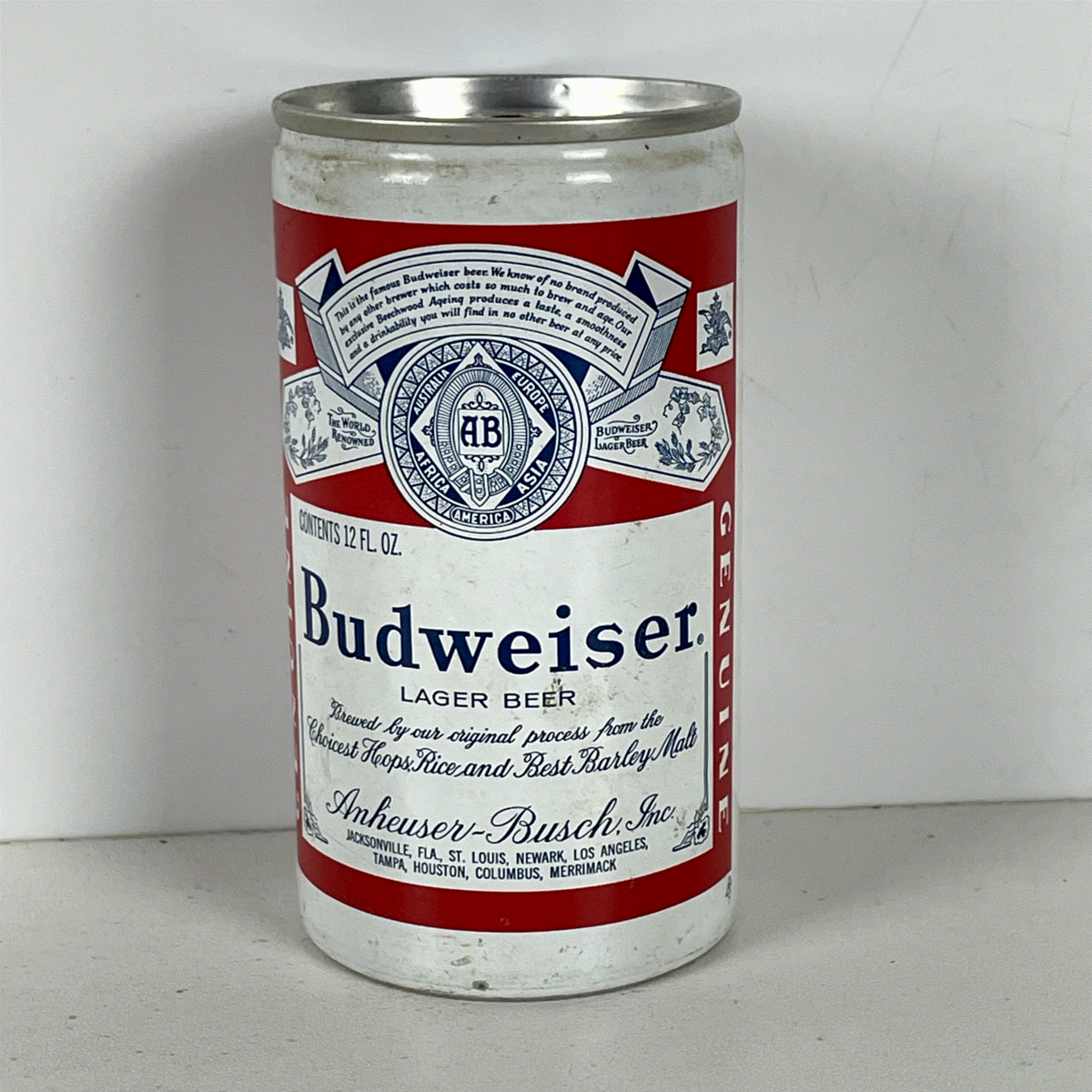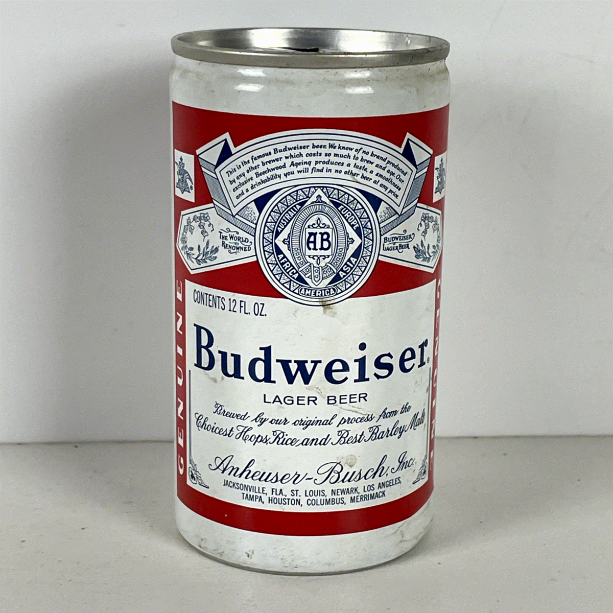 Crafted from aluminum, this 12 Fl. Oz. can features a convenient pop-top opening, characteristic of its era. The label details the brewing process with "Choicest Hops, Rice and Best Barley Malt" and lists various Anheuser-Busch locations, adding to its authentic appeal. Vertical "GENUINE" text adorns the sides, emphasizing its original design. This can is a testament to Budweiser's enduring legacy and its classic American heritage, offering a unique glimpse into the brand's storied past. Ideal for display in a home bar, man cave, or as part of a larger collection.