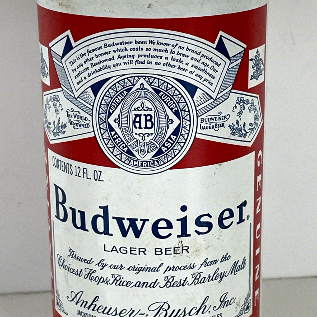 Discover a piece of brewing history with this classic Budweiser Lager Beer can. This vintage-style collectible features the iconic red, white, and blue design that has made Budweiser a household name. The detailed label proudly displays the "AB" crest, "The World Renowned" motto, and lists "Budweiser Lager Beer" brewed by Anheuser-Busch, Inc. The can's design evokes a sense of nostalgia, showcasing the traditional elements that define this celebrated American brew. A perfect addition for beer can collectors or enthusiasts of vintage advertising. Its distinctive look makes it a standout display piece.