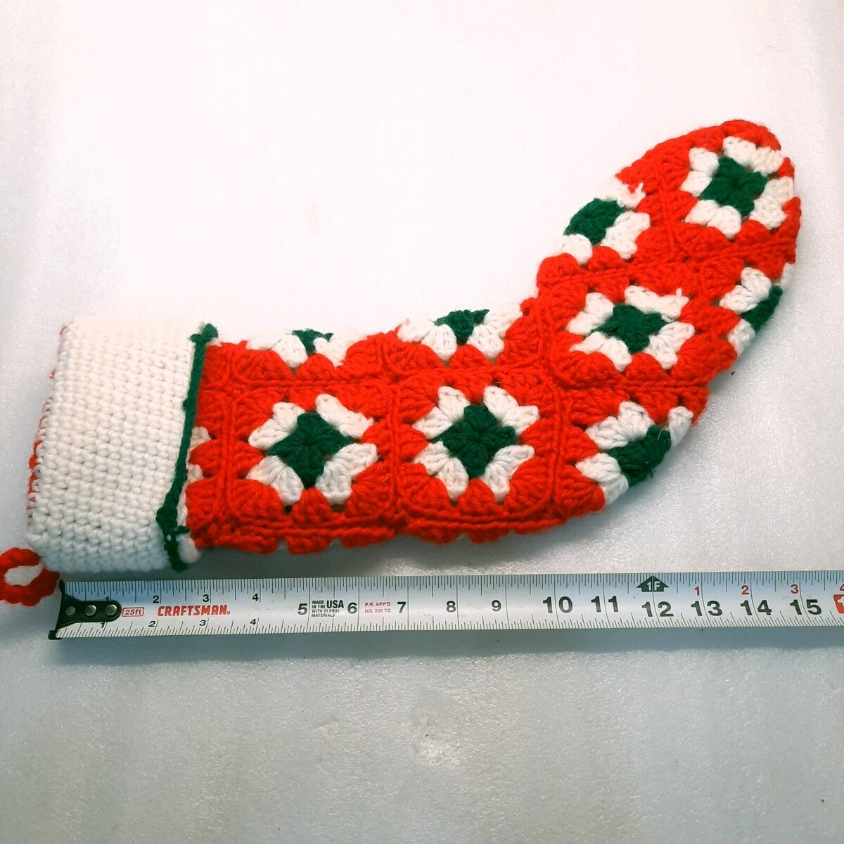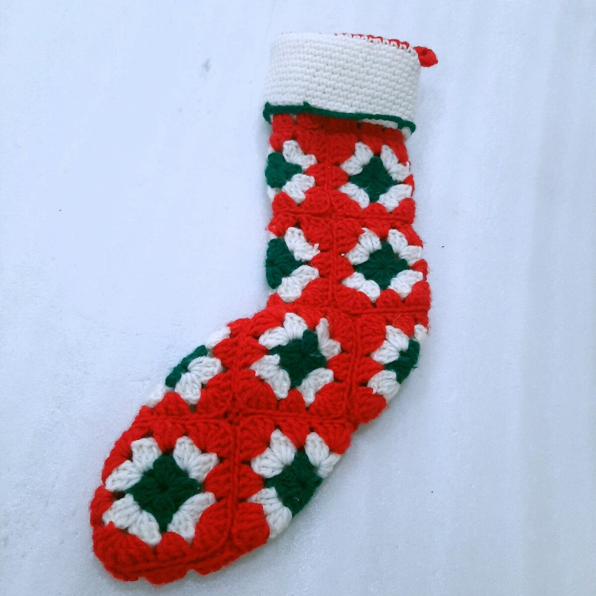 Vintage Christmas Stocking Crocheted red green white patchwork granny handmade