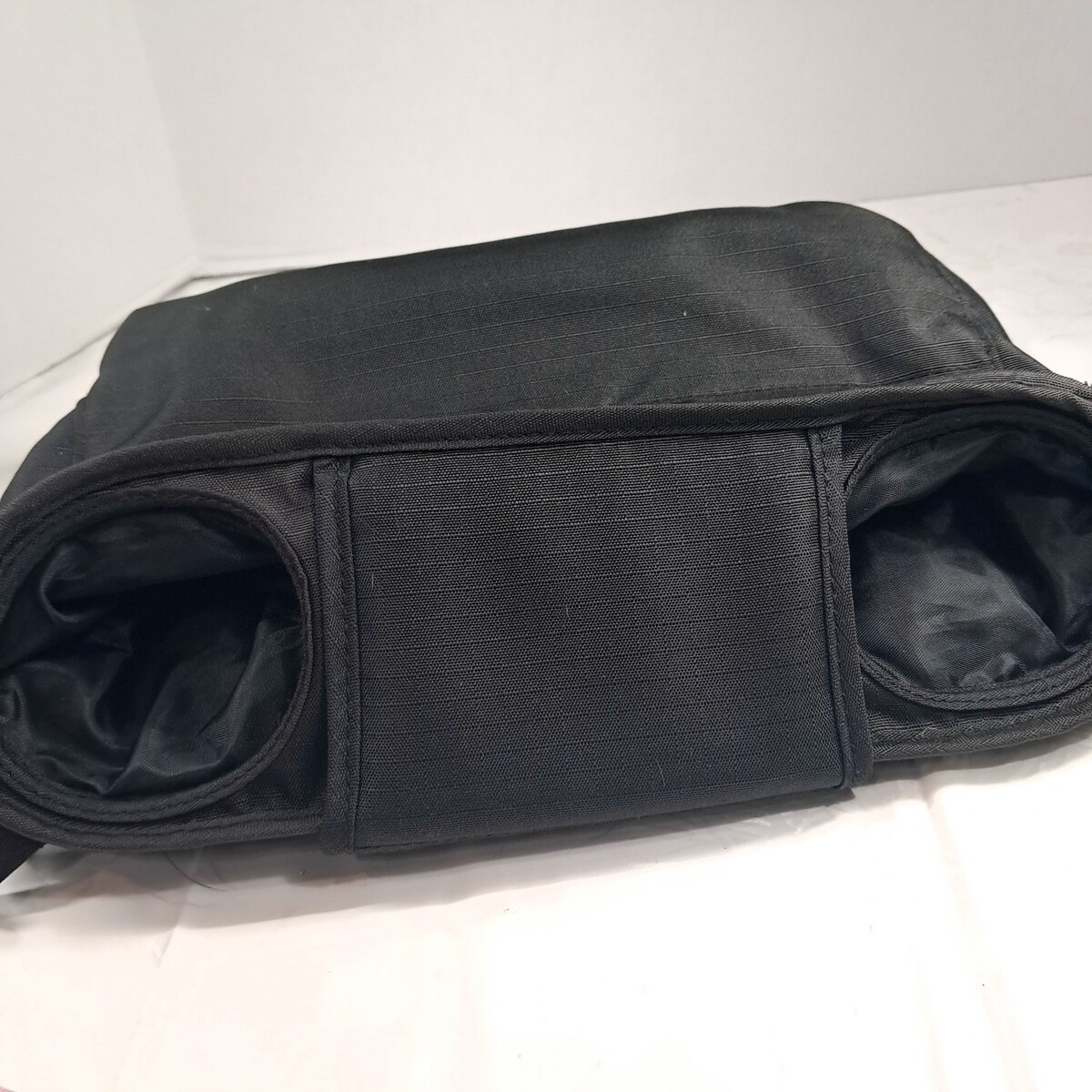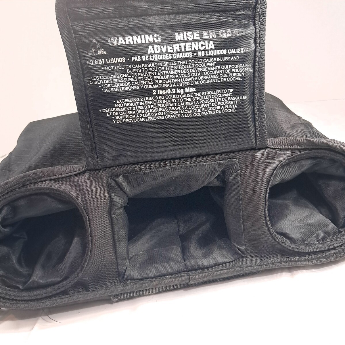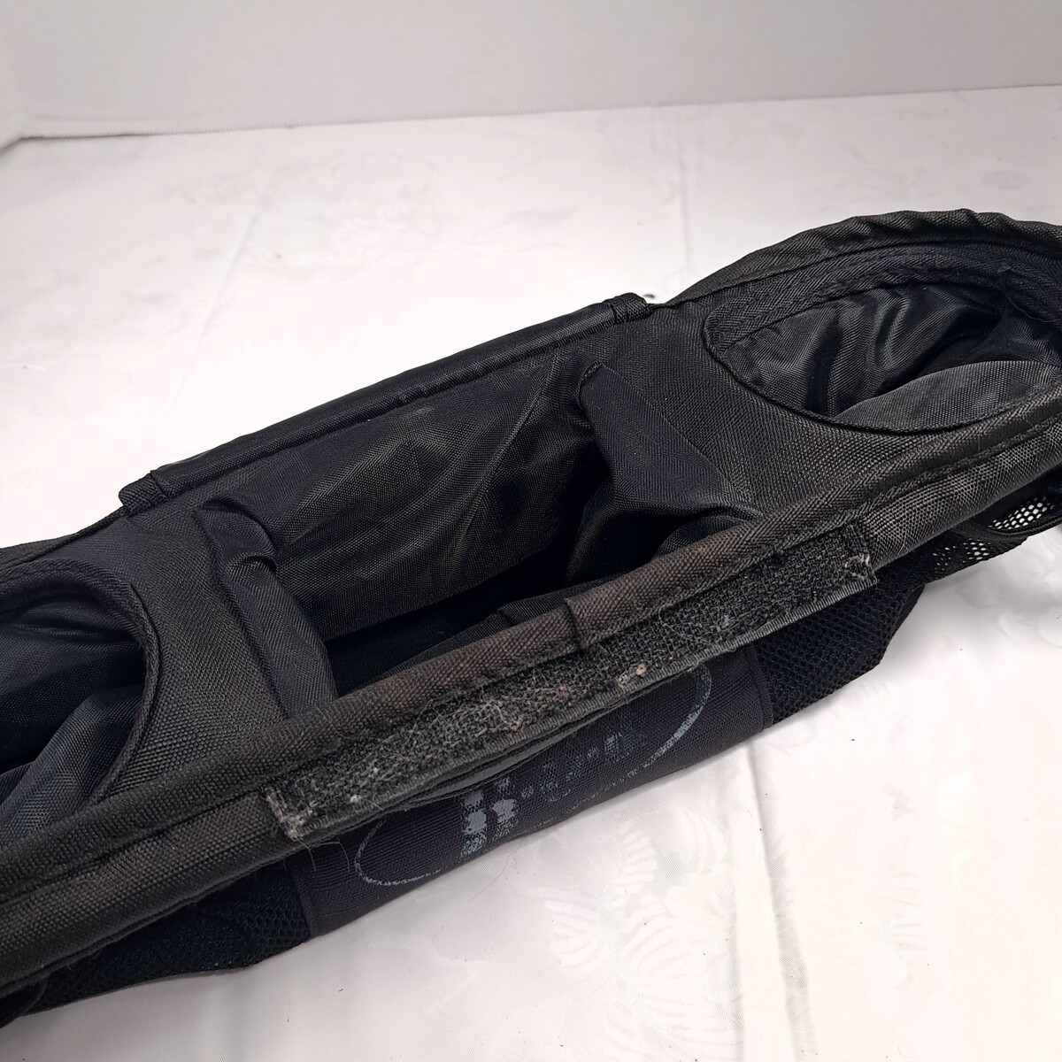 For single jogging stroller size. Black fabric. Shows wear/fading to the logo and slight wear fading as shown. Holds 2 cups and has a center compartment. See pics for details.