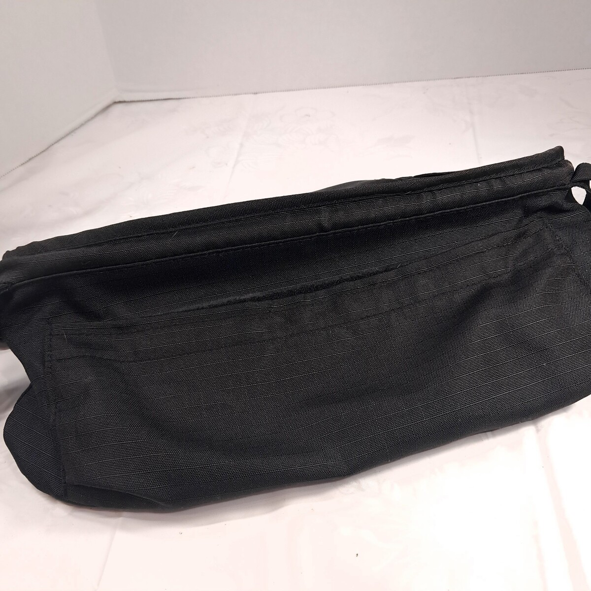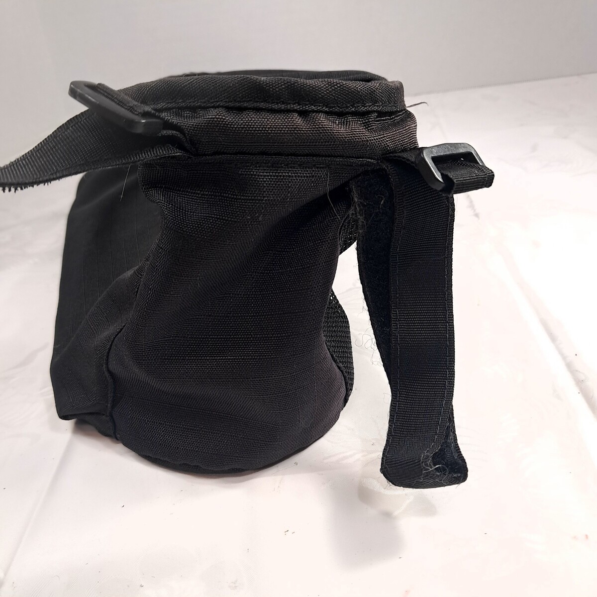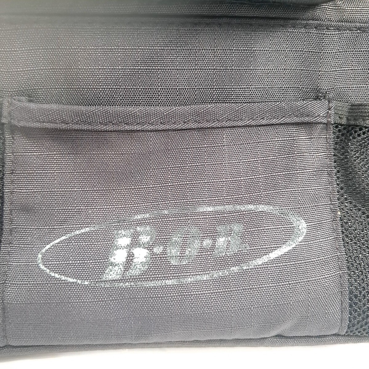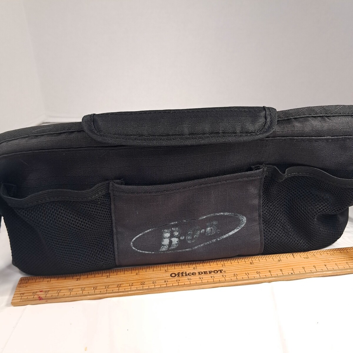For single jogging stroller size. Black fabric. Shows wear/fading to the logo and slight wear fading as shown. Holds 2 cups and has a center compartment. See pics for details.
