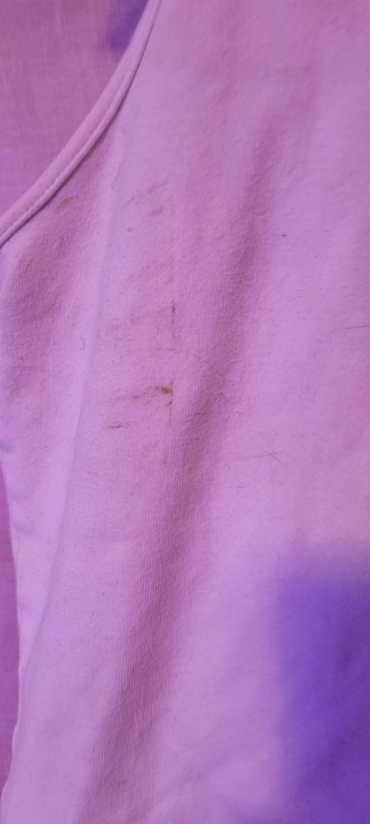 This shirt is in fair used condition. As seen in the photos there are a few spots. They could possibly be cleaned with some bleach or a more aggressive cleaner. We do not use more aggressive cleaning due to people having sensitive skin and allergies. The size is XL. Measurements are approximately: Length: 22 inches. Pit to Pit: 18 inches.