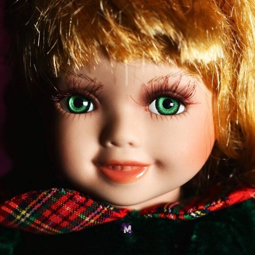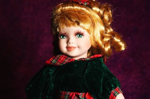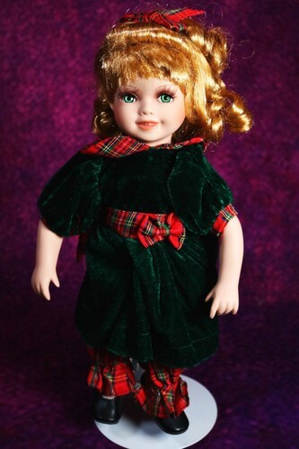 You will be receiving a beautiful porcelain doll. Kangrith is around 11-12 inches tall. Her body is stuffed and his head, neck, and arms are made of porcelain. She has long, curly blonde hair topped with a bow and deep green eyes. She is wearing a green and red-plaid dress.