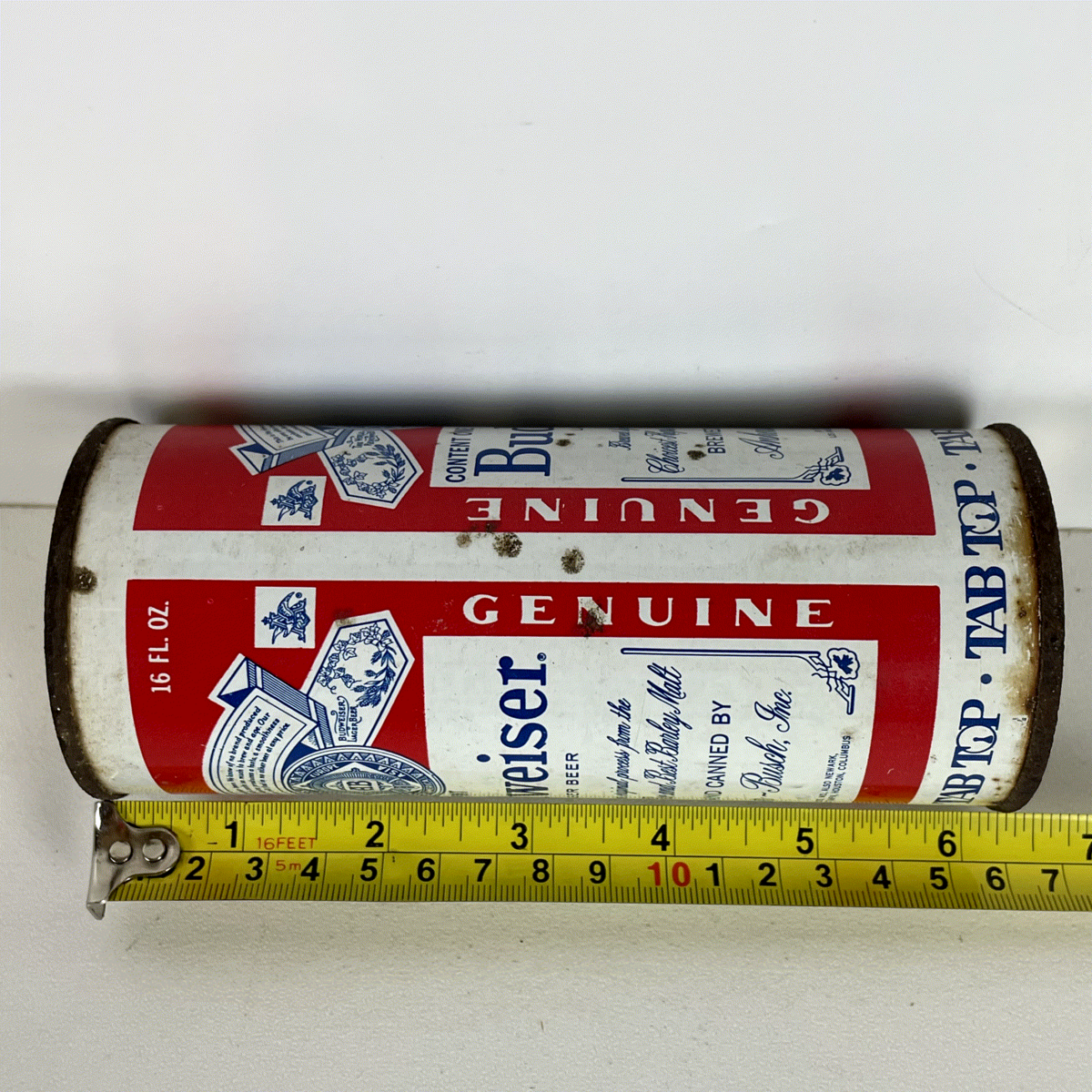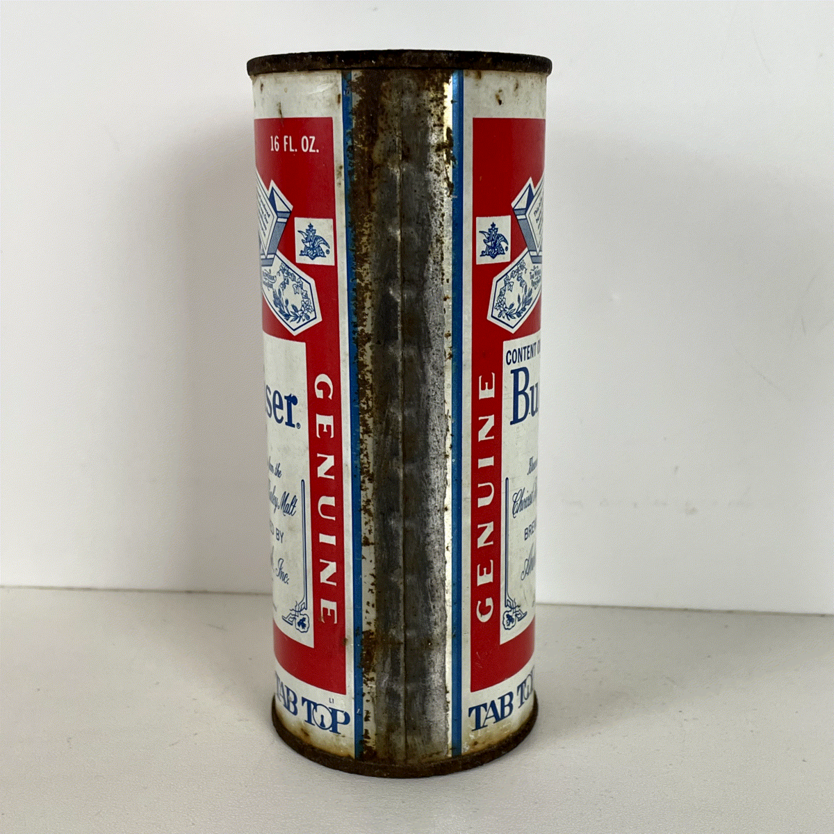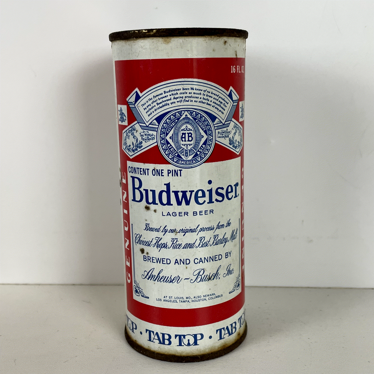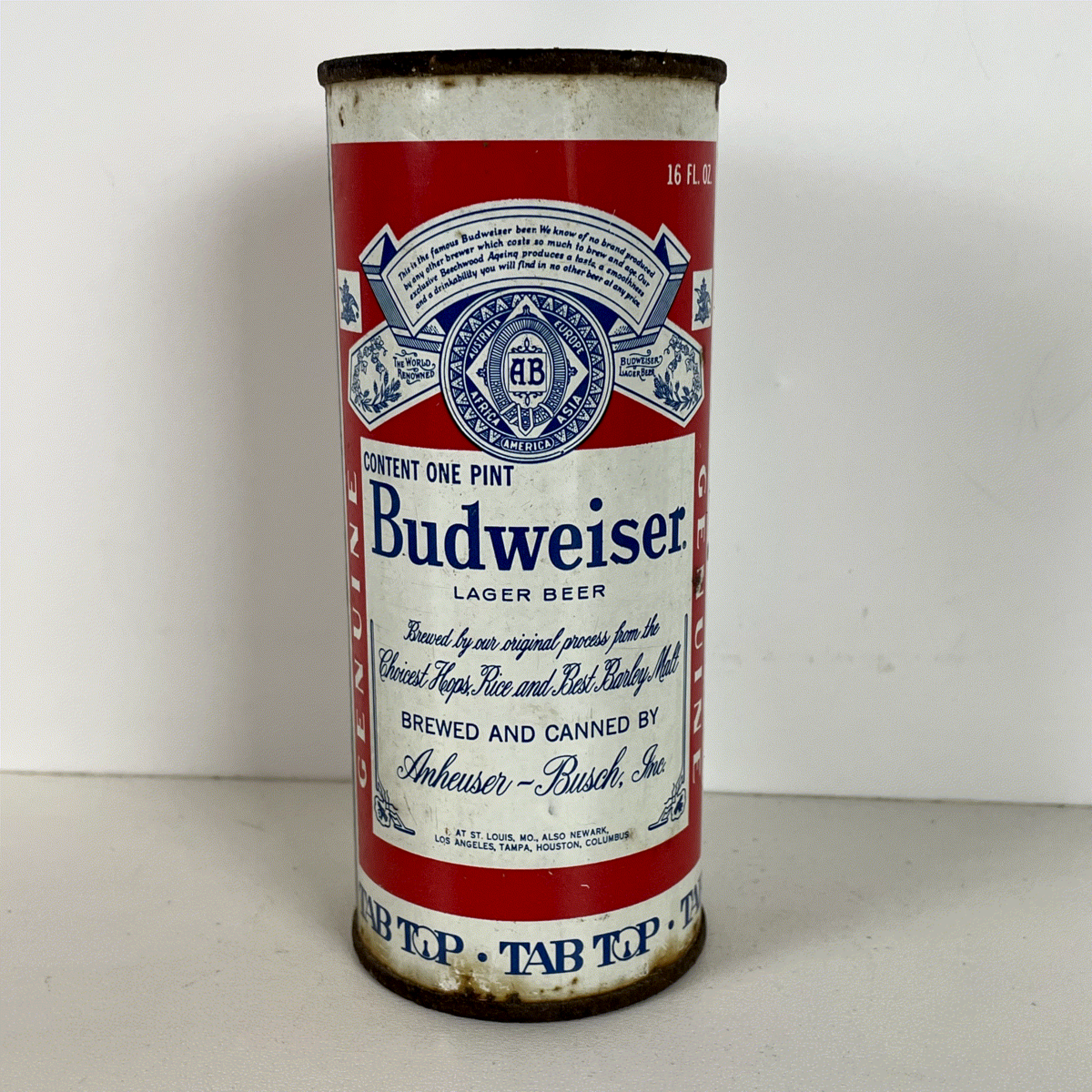 This particular example features the sought-after Tab Top opening, a hallmark of vintage beer can collecting. The detailed artwork includes the Anheuser-Busch, Inc. branding and lists various US production locations, adding to its historical significance. A must-have for any serious beer can collector, this item captures the essence of classic American brewing and design.