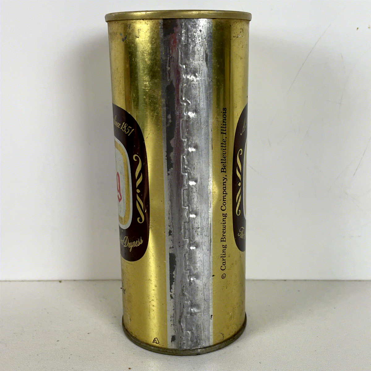 This collectible one-pint (16oz) tall boy can is constructed from steel and features a traditional pull-top opening. The side panel includes the official manufacturing details from Carling Brewing Company, adding to its authenticity for serious collectors. The vertical orientation and vibrant color palette make it an eye-catching display piece for any bar, man cave, or breweriana collection. Its unique size and classic mid-century aesthetic capture a specific era of American beer production.