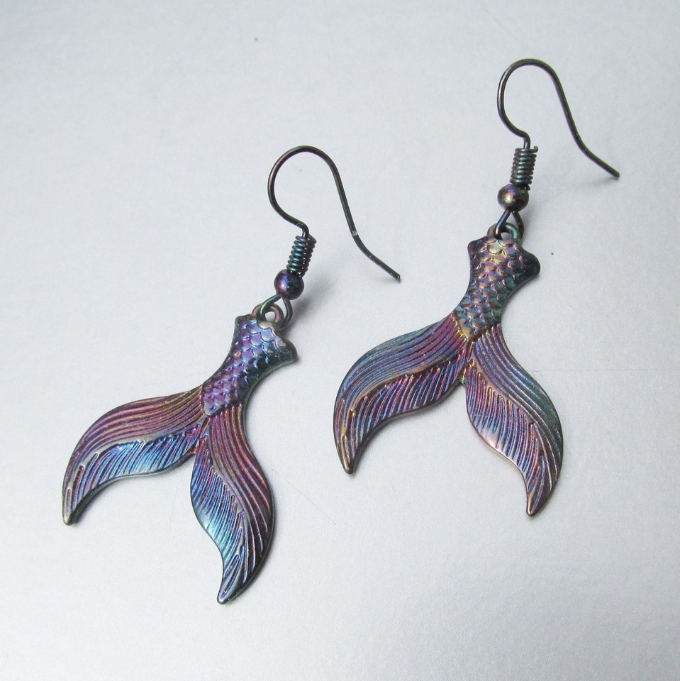 Dangle WHALE TAIL Aurora Borealis AB Black Metal Pierced Vintage Earrings