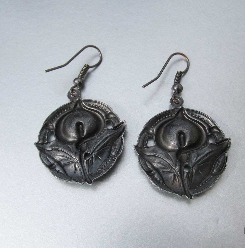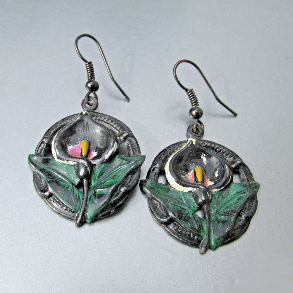 Black CALLA LILY Enamel Dangle Vintage Handmade Pierced Earrings