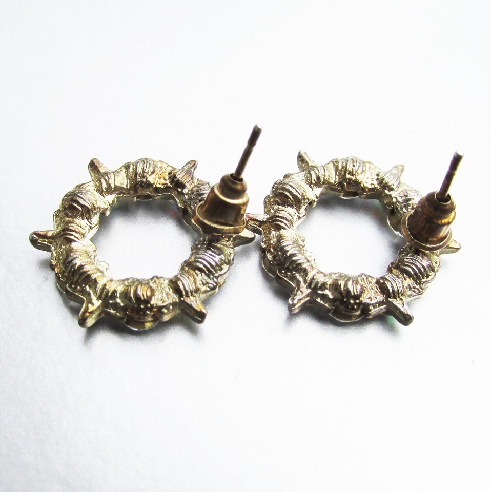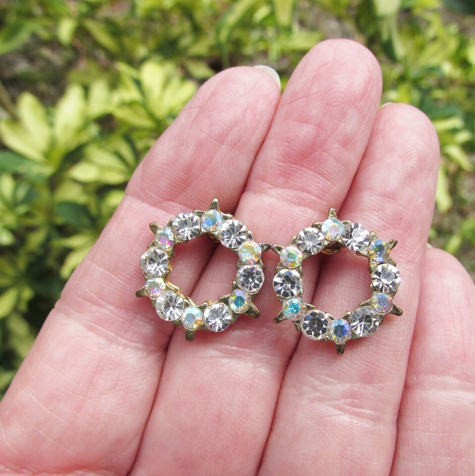 This is a pair of vintage 1960s round gold tone pierced earrings that are set with aurora borealis rhinestones and every other setting is star shaped. They are in excellent condition with no wear or damage and measure 3/4" wide, so are not large. They will arrive gift boxed. 3486