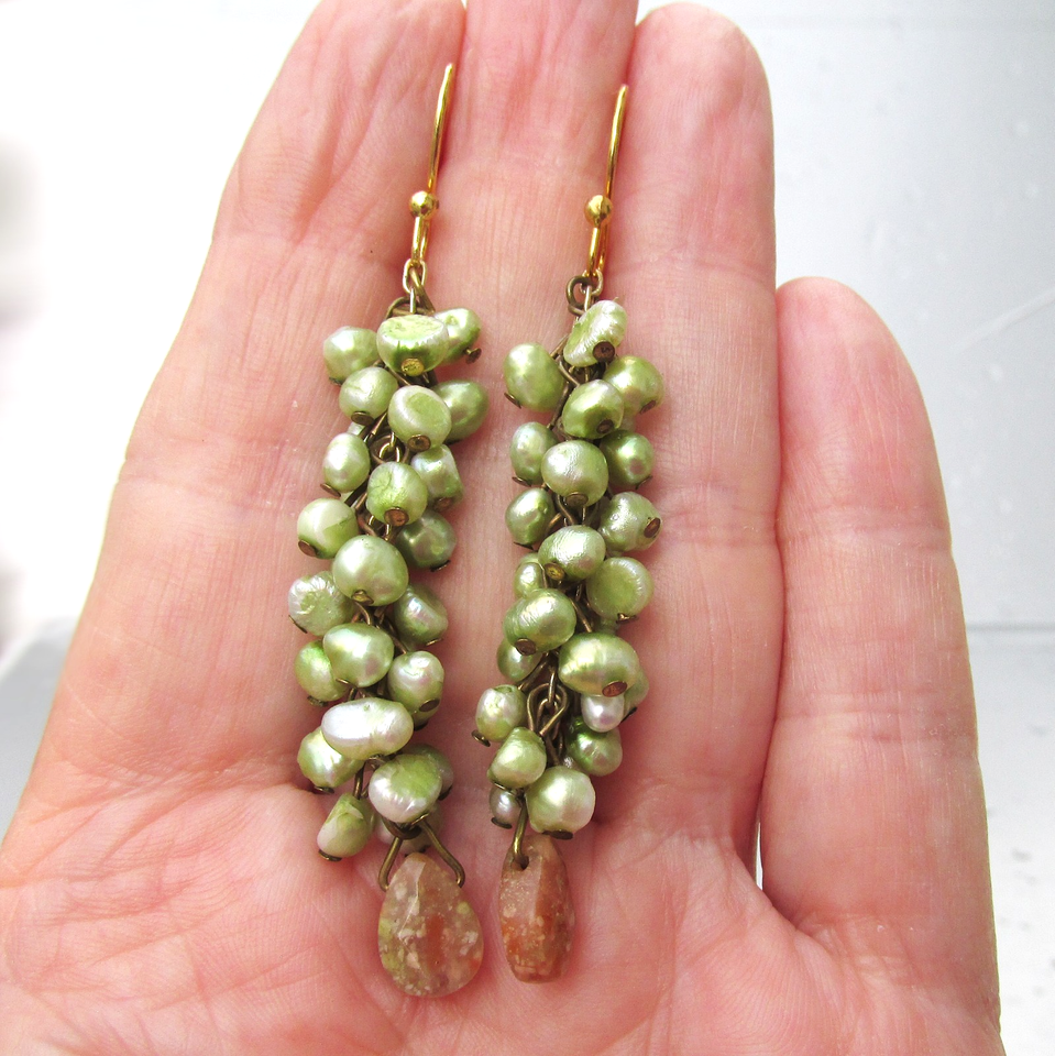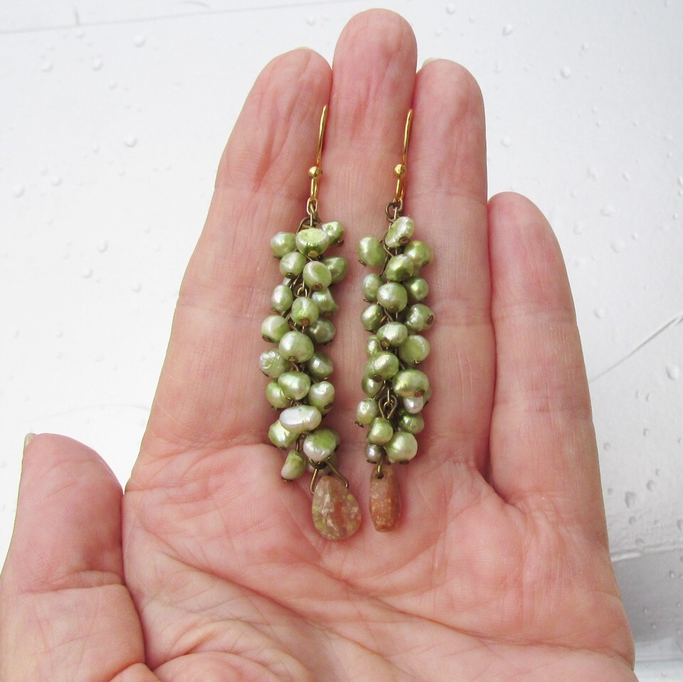 This is a 2 7/8" long pair of vintage 1990s earrings with gold plated sterling silver ear wires for pierced ears and a long narrow cluster of tiny green baroque oval freshwater pearls hanging on chain, plus a teardrop shaped orange jasper stone on the bottom. They are in excellent condition with no wear or damage. They will arrive gift boxed. 3212