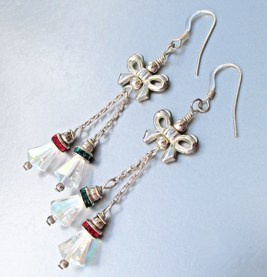 These very pretty vintage dangle pierced earrings are in mint condition - look brand new, like they were never worn. They are 2 1/2" long dangles with a bow on top and two red and green rhinestone topped crystal bells hanging on fine chain. The French ear wires were acid tested as 925 sterling silver and the dangles are silver-tone metal. They will arrive gift boxed. 3036