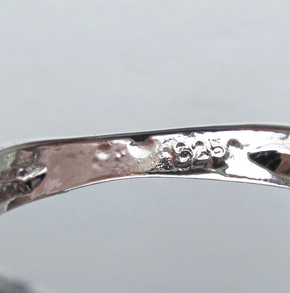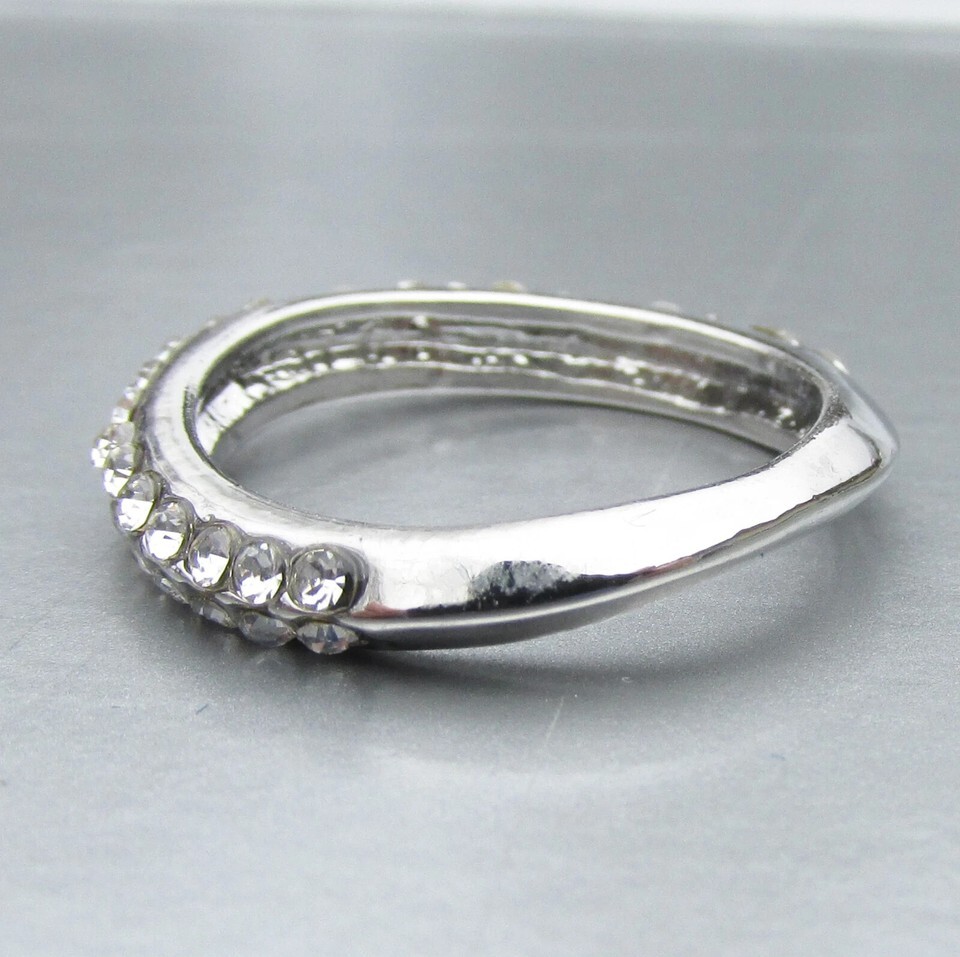 This very pretty sterling silver band ring has two rows of tiny crystal clear cubic zirconia stones and the band has a very slight waviness to the design. It is marked 925 for sterling, plus it has a marker's mark which is too blurry to read. It is size 6 1/2 and is in excellent condition with no signs of any wear and no damage. It will arrive gift boxed. 2736