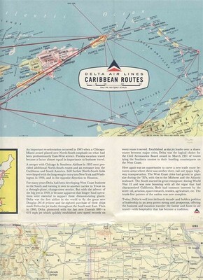 A Delta Airlines route map for 1969. On one side is information and route map on Southern Transcontinental routes and Caribbean Route. On the other side is a map of the Delta Eastern routes. In fine condition.