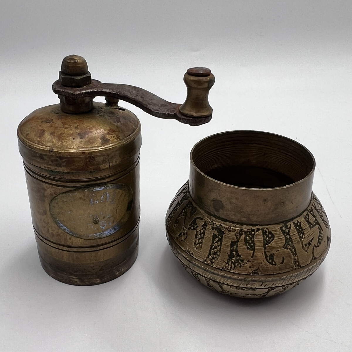 Antique Turkish Brass Pepper Grinder Hand Engraved Spice Mill Rustic Working