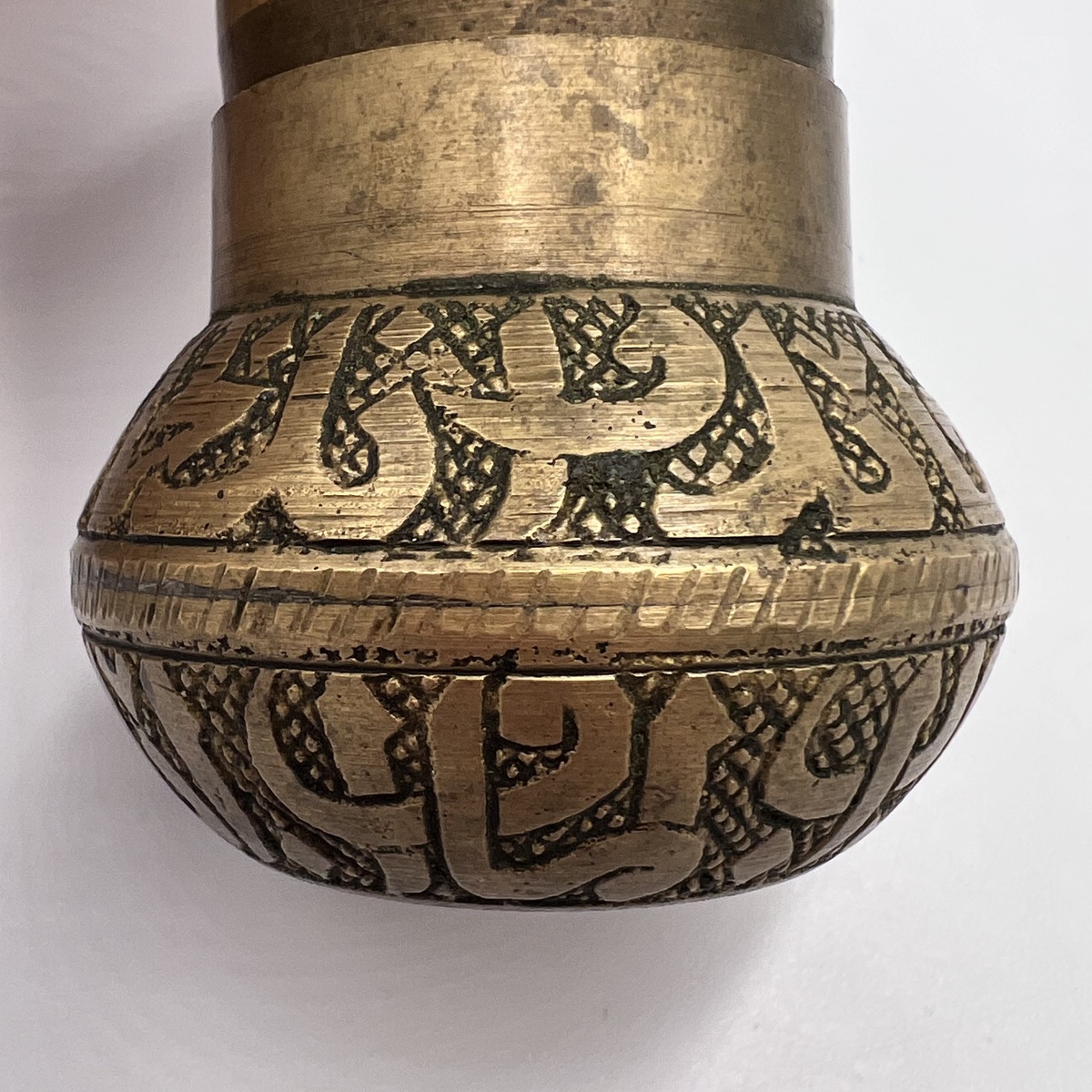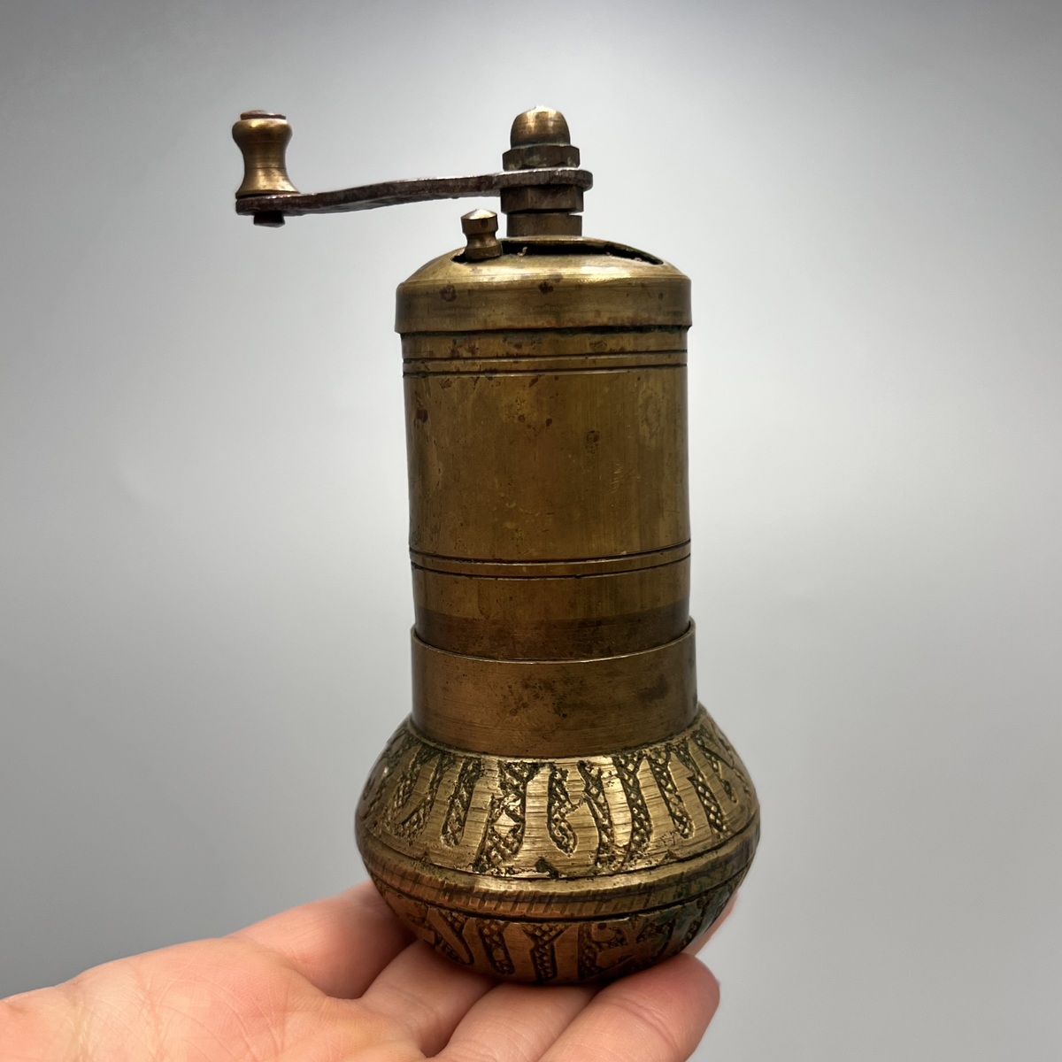 This authentic antique Turkish pepper grinder is a wonderful example of traditional Middle Eastern craftsmanship. Hand-engraved brass with flowing Arabic-style motifs gives it a distinctive oriental character, while the aged patina highlights its decades of use and history.
