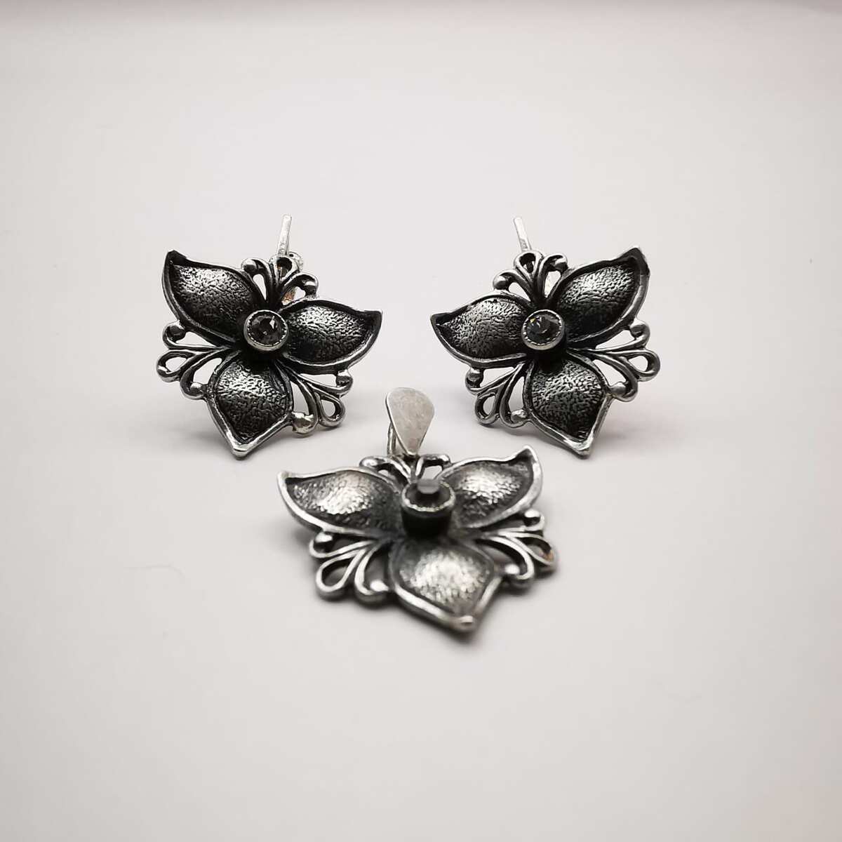 Vintage Ice Flower Jewelry Set 925 Sterling Silver Pendant & Earrings with Zirc