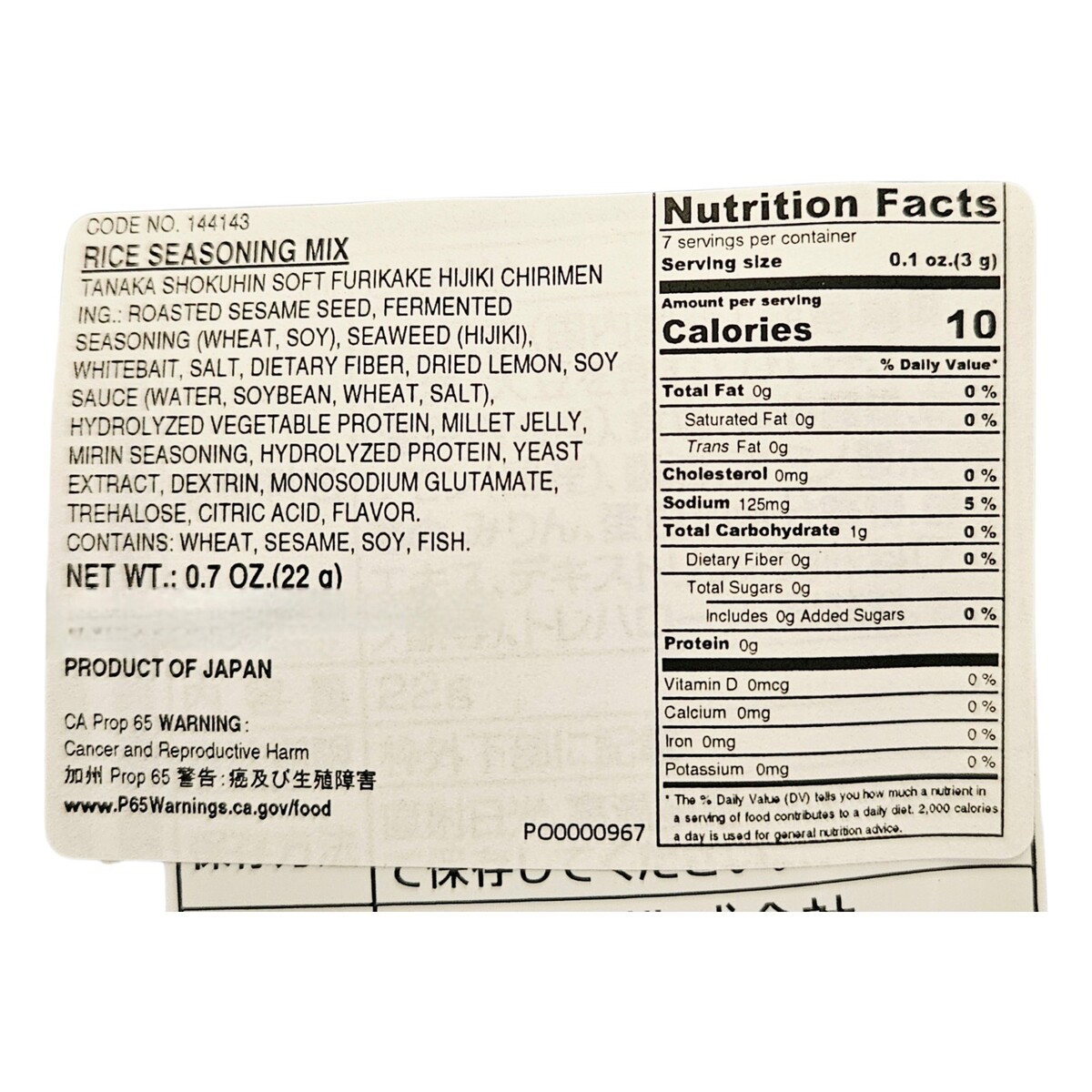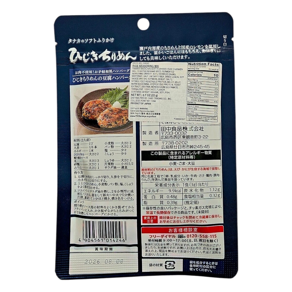 Ingredients: Roasted sesame seeds, fermented seasoning (wheat, soy), seaweed (hijiki), whitebait, salt, dietary fiber, dried lemon, soy sauce (water, soybean, wheat, salt), hydrolyzed vegetable protein, millet jelly, mirin seasoning, hydrolyzed protein, yeast extract, dextrin, monosodium glutamate, trehalose, citric acid, and flavoring.